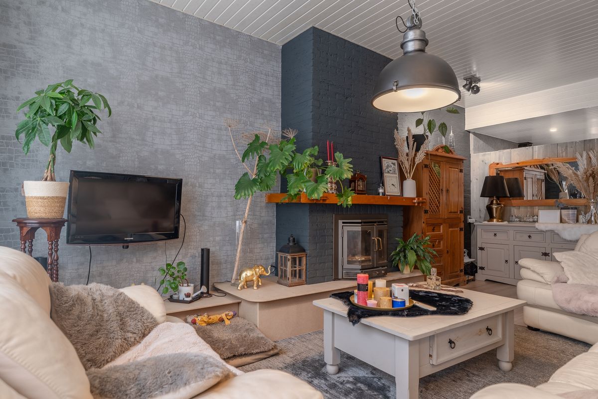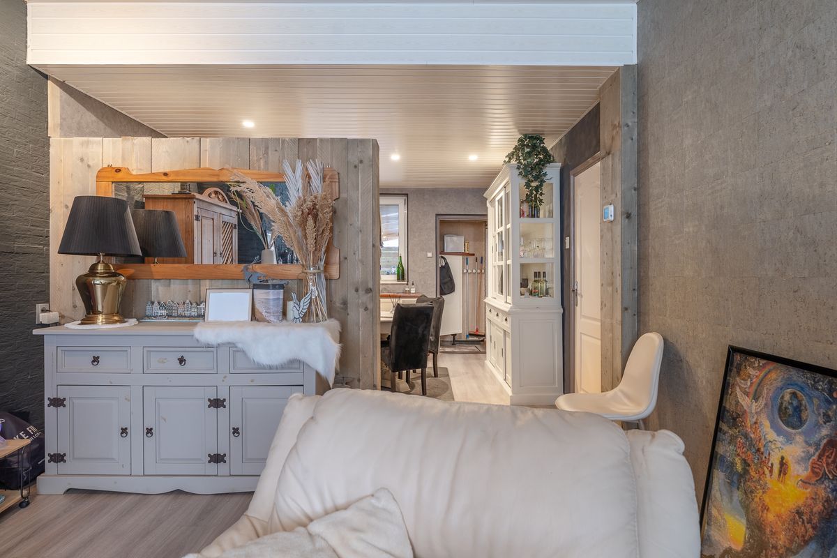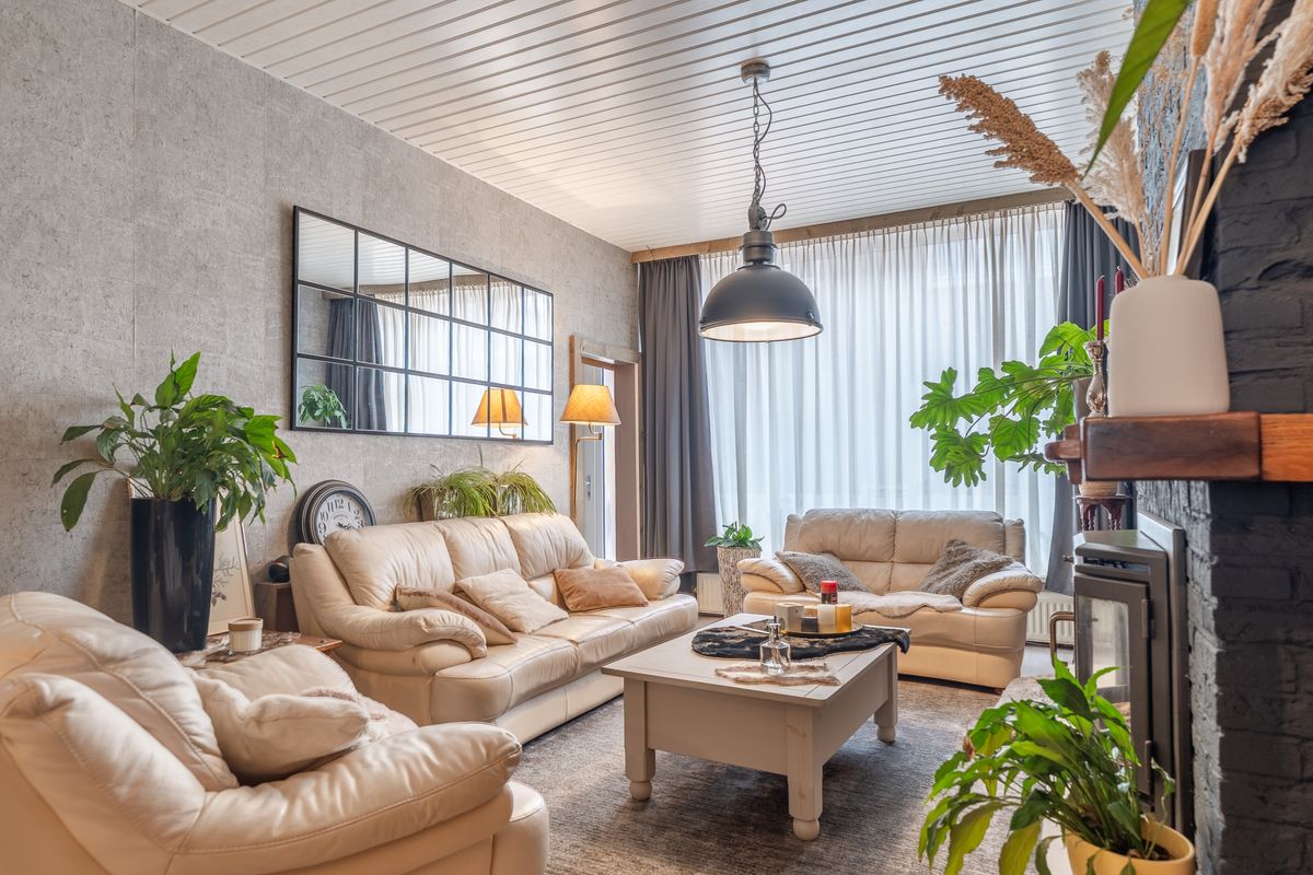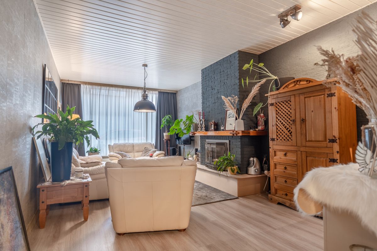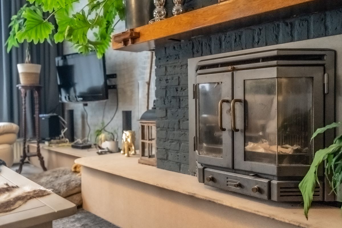 De woonkamer ligt aan de straatzijde en heeft een prettige sfeer, met een houtkachel als centraal punt en een groot raam dat zorgt voor veel lichtinval.