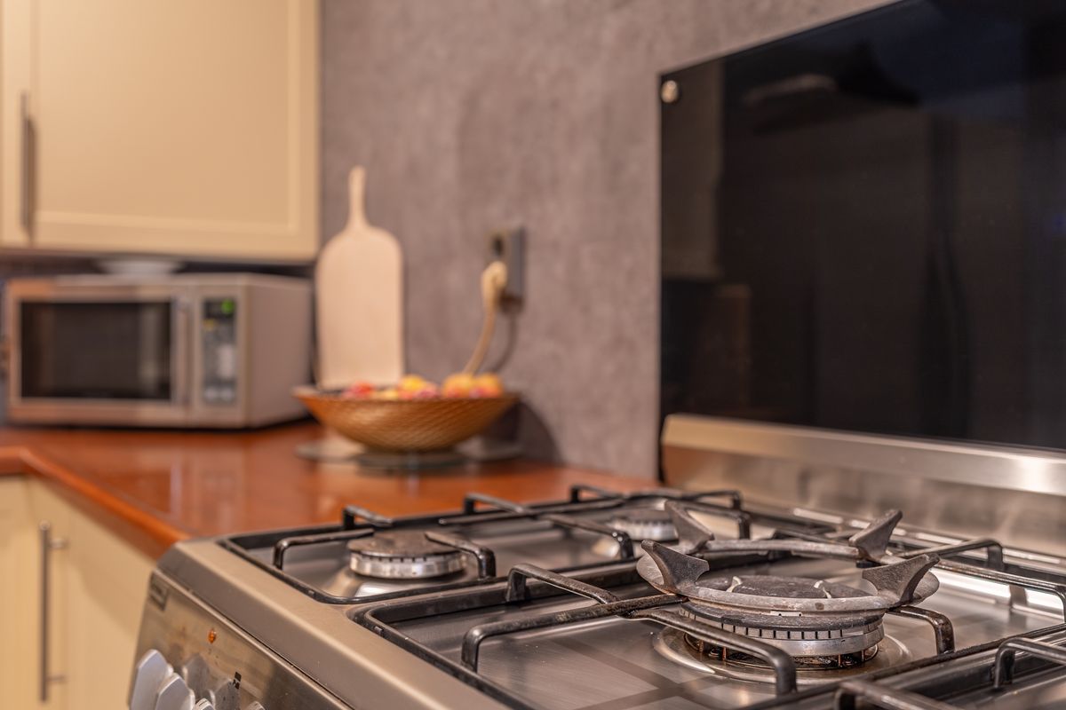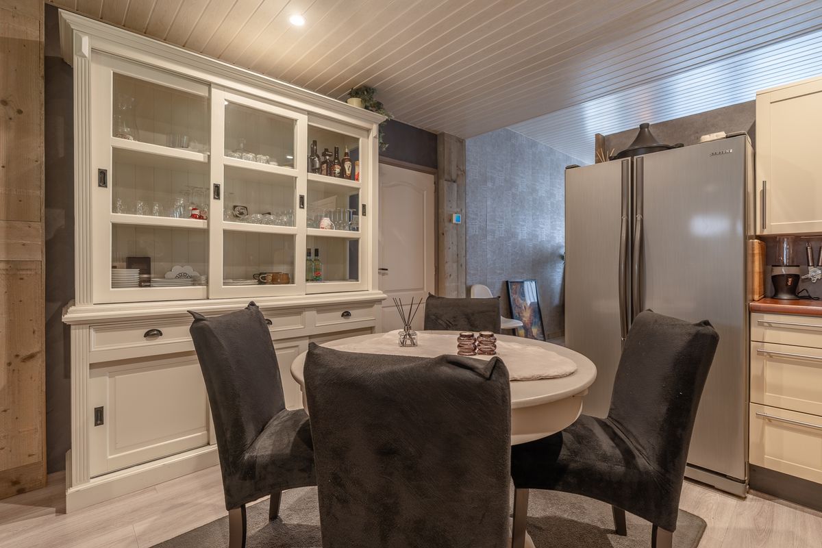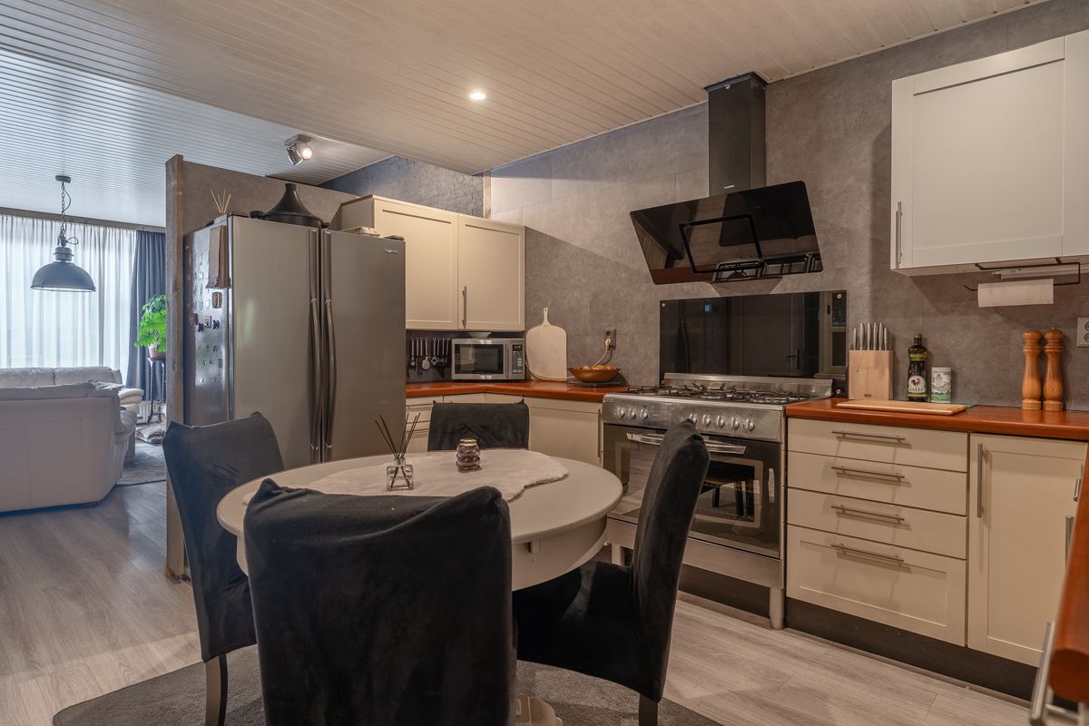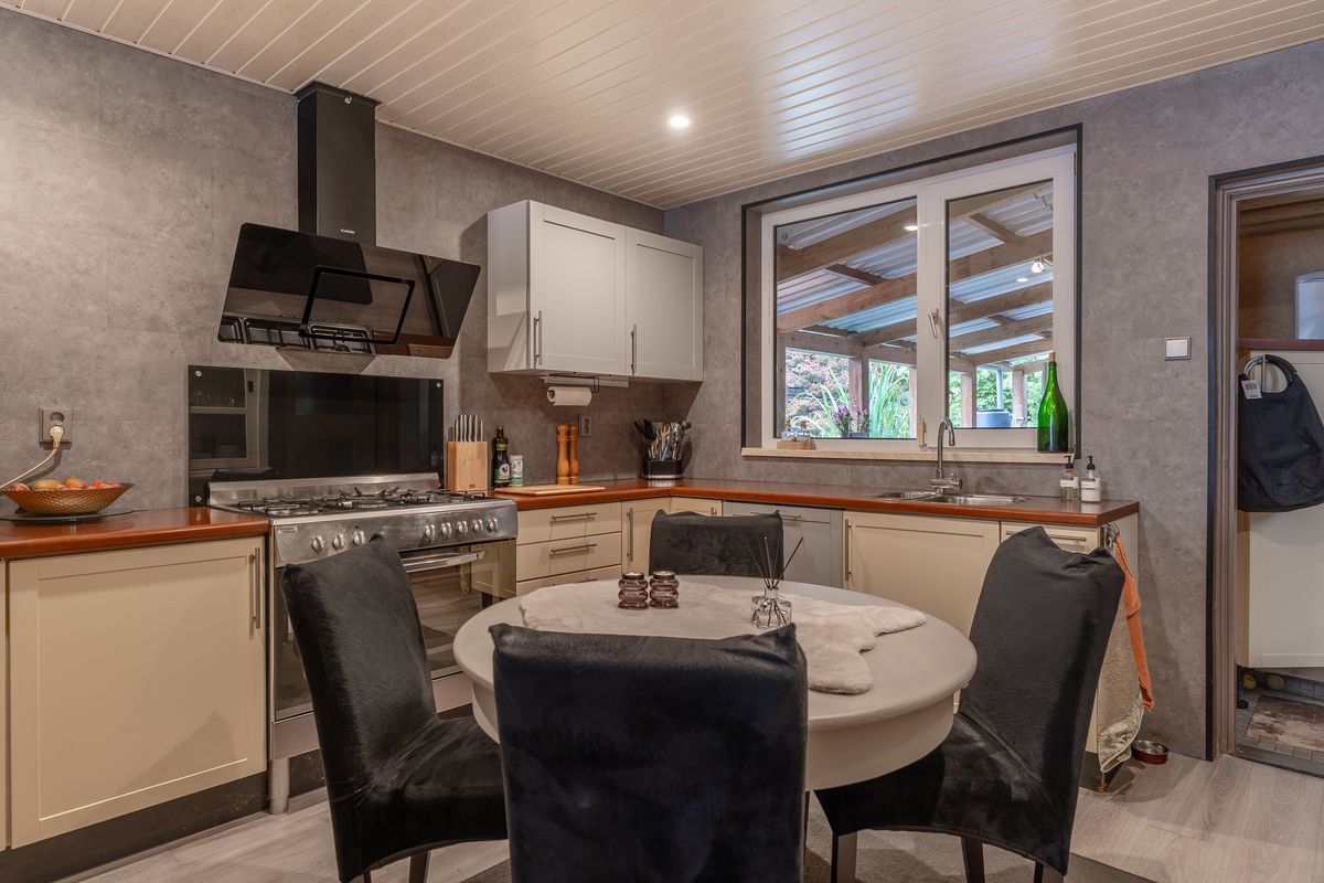 Aansluitend ligt de keuken in U-opstelling, voorzien van een 5-pits gasfornuis met oven, afzuigkap, koelkast en volop kastruimte.