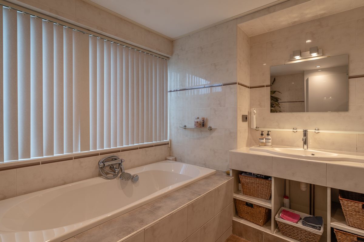 De badkamer is ruim en verzorgd, uitgerust met een inloopdouche, ligbad, wastafelmeubel en radiator – een nette ruimte met lichte betegeling en een rustige uitstraling.