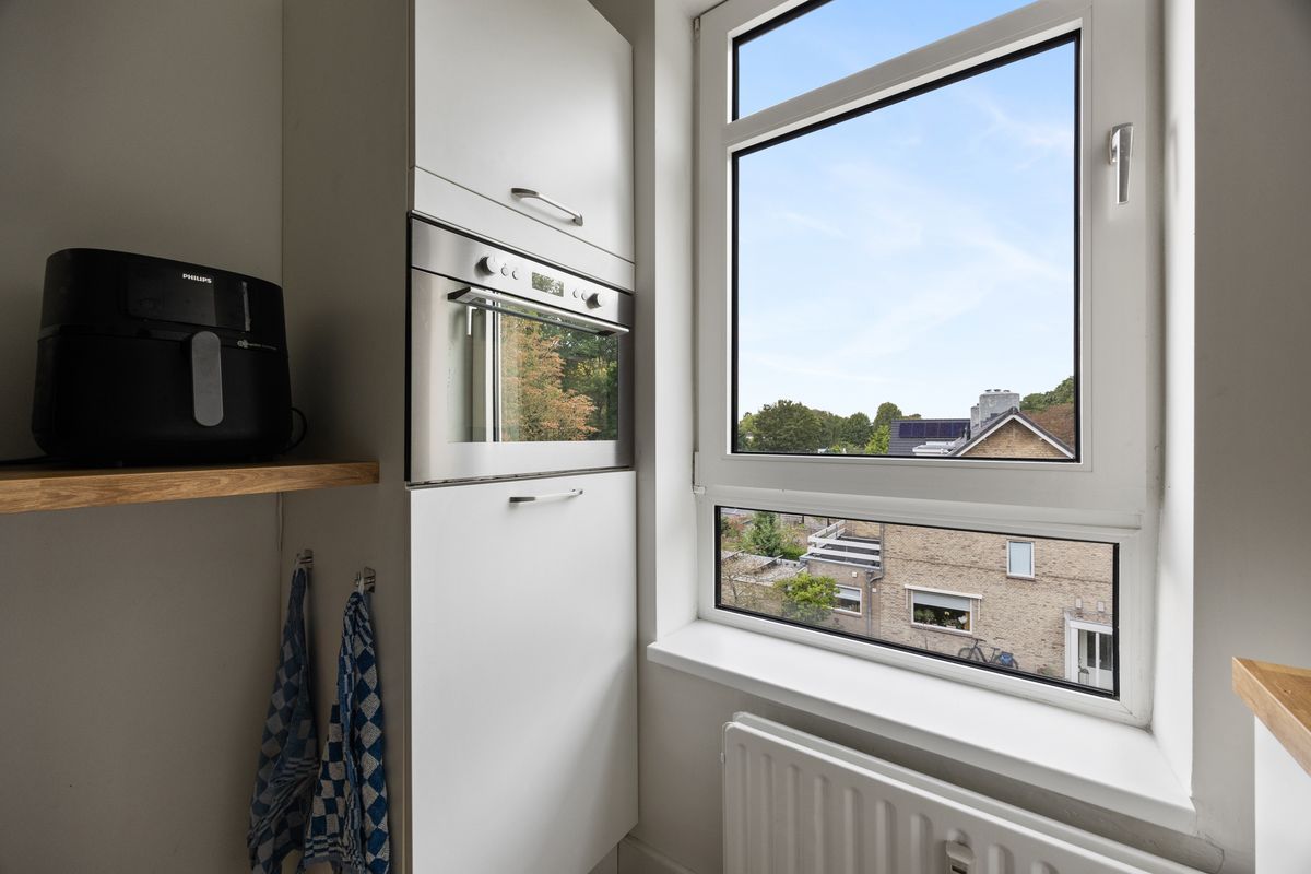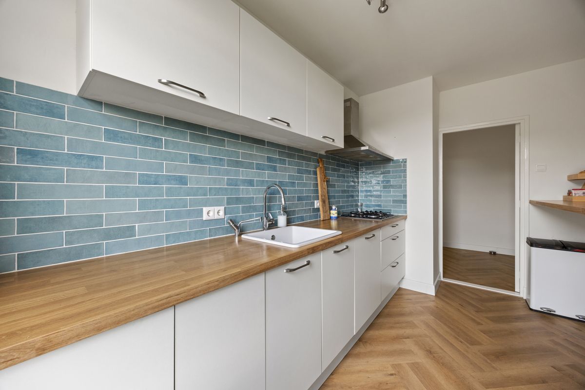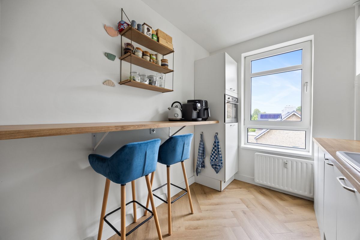 De afgesloten keuken zorgt voor rust in de woonkamer en biedt volop kastruimte en werkblad. De keuken is voorzien van de nodige inbouwapparatuur, waardoor koken hier zowel praktisch als plezierig is, ook bevind zich hier de aansluiting voor de wasmachine.