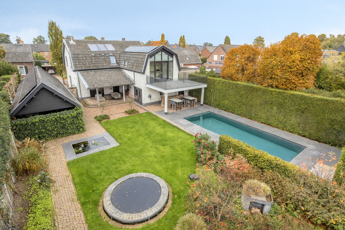 De fraai aangelegde tuin is een ware oase. Hier vind je een groot zwembad, een ingegraven trampoline, een vijverpartij en een overdekt terras met buitenkeuken. De hoge groene hagen zorgen voor optimale privacy. Daarnaast is er een vrijstaande garage/berging met oprit aanwezig.