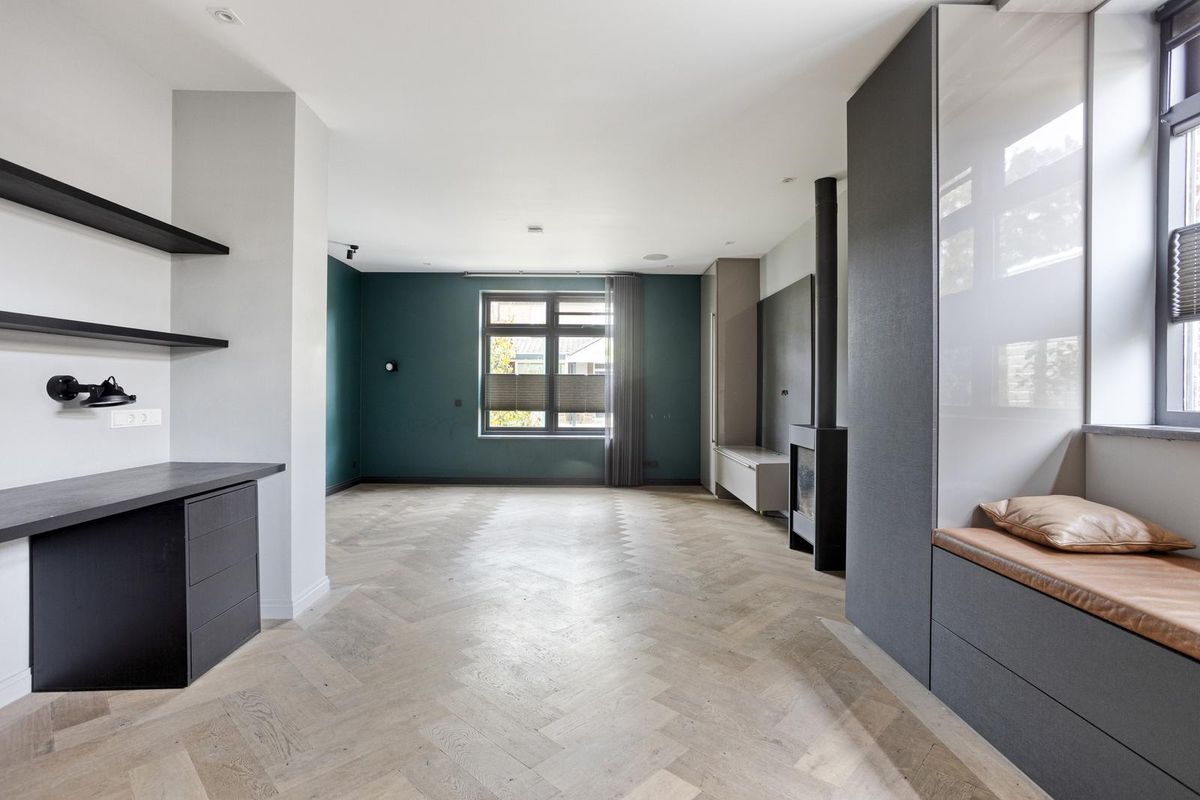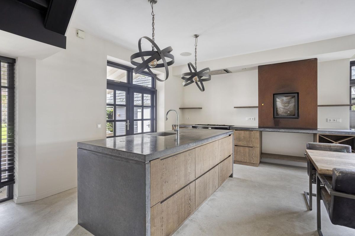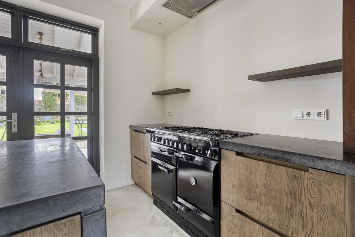 Ontvangsthal met toegang tot de woonkamer en de woonkeuken. De ruime woonkeuken vormt het hart van het huis. De keuken is voorzien van een groot kookeiland, een luxe fornuis met meerdere ovens en moderne inbouwapparatuur. De robuuste houten kasten en industriële accenten zorgen voor een warme, eigentijdse uitstraling. Aansluitend bevindt zich de lichte woonkamer met een sfeervolle haard, visgraatvloer en maatwerkmeubilair. Aangrenzend is de bijkeuken met toegang tot de badkamer en multifunctionele kamer.