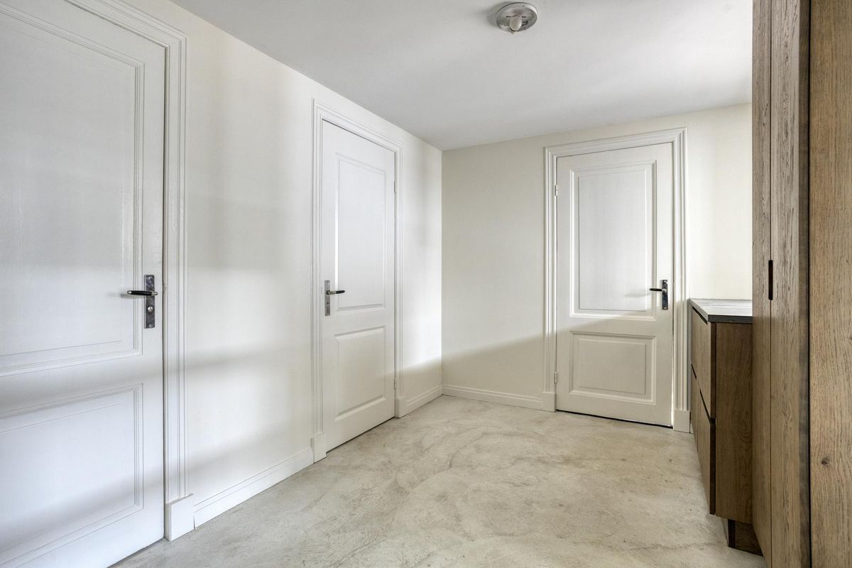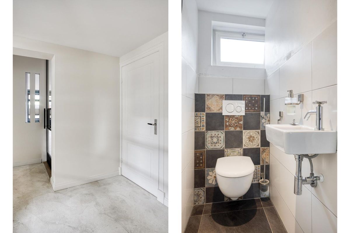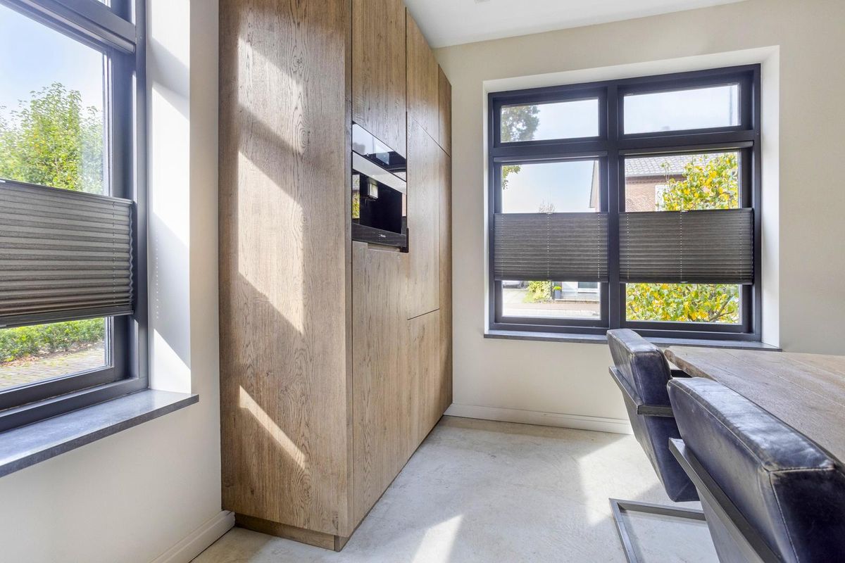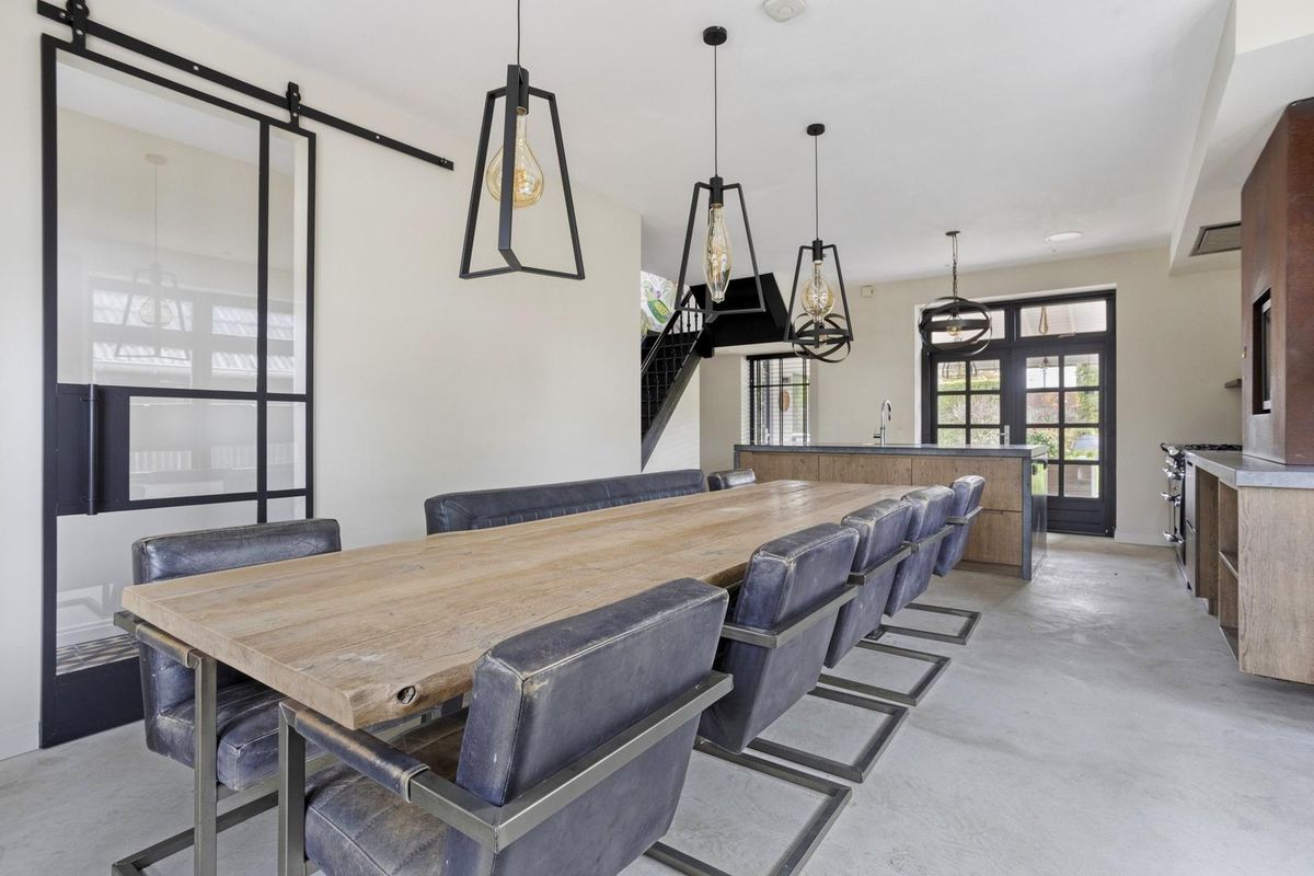 Ontvangsthal met toegang tot de woonkamer en de woonkeuken. De ruime woonkeuken vormt het hart van het huis. De keuken is voorzien van een groot kookeiland, een luxe fornuis met meerdere ovens en moderne inbouwapparatuur. De robuuste houten kasten en industriële accenten zorgen voor een warme, eigentijdse uitstraling. Aansluitend bevindt zich de lichte woonkamer met een sfeervolle haard, visgraatvloer en maatwerkmeubilair. Aangrenzend is de bijkeuken met toegang tot de badkamer en multifunctionele kamer.