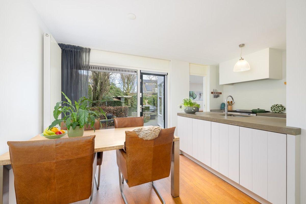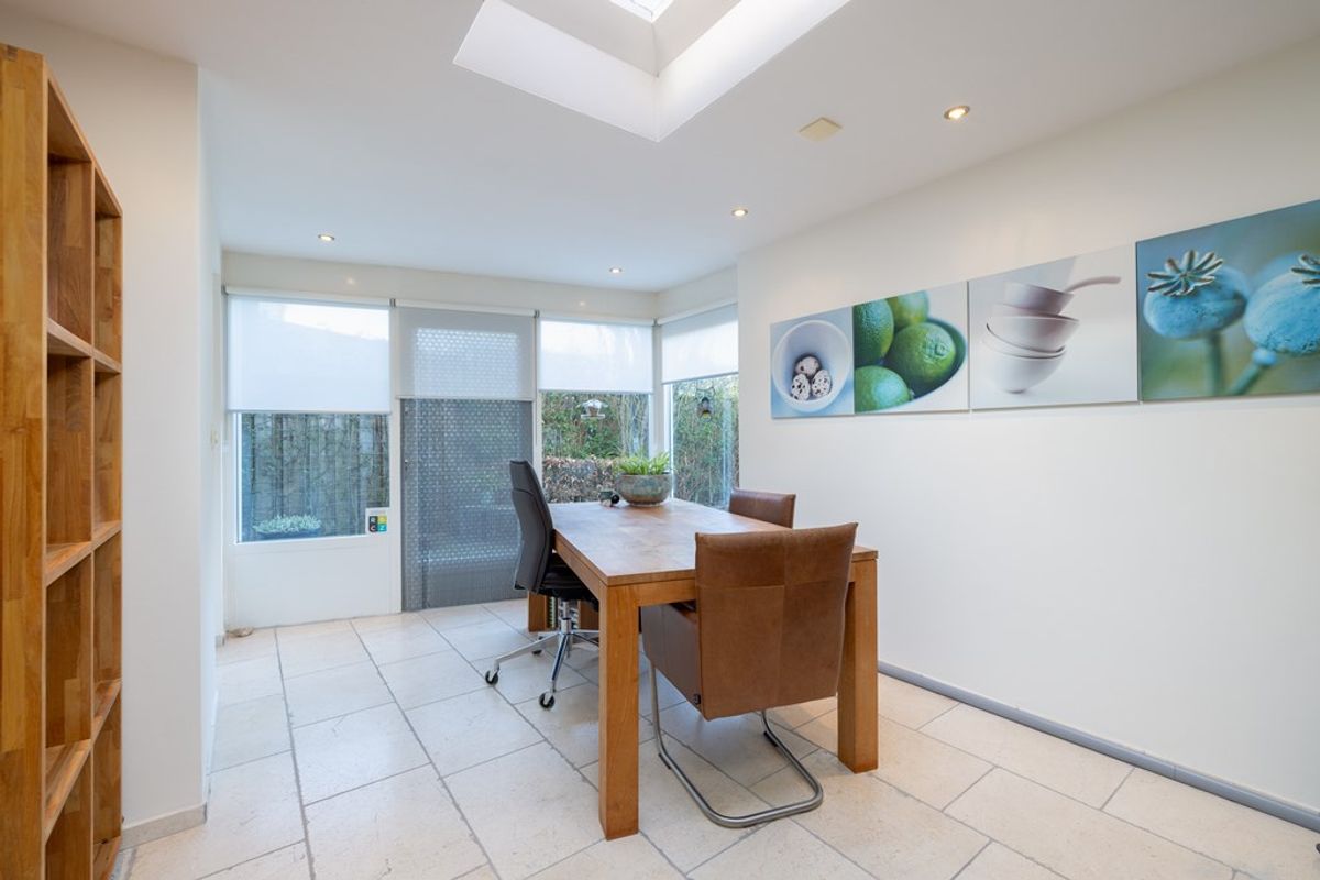 Voorbij de keuken opent de woning zich richting de royale werkkamer van circa 14 m². Dankzij de lichtstraat valt hier aangenaam veel daglicht binnen, wat zorgt voor een prettige en professionele sfeer. Momenteel ingericht als stijlvolle praktijkruimte, maar moeiteloos aan te passen naar thuiswerkplek, hobbyruimte of speelkamer.