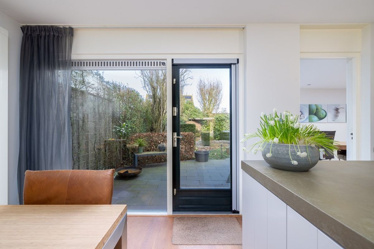 Vanuit de keuken is er directe toegang tot de achtertuin met meerdere terrassen een natuurlijke verlenging van de leefruimte.
