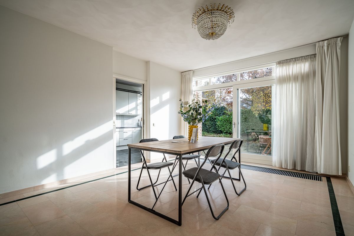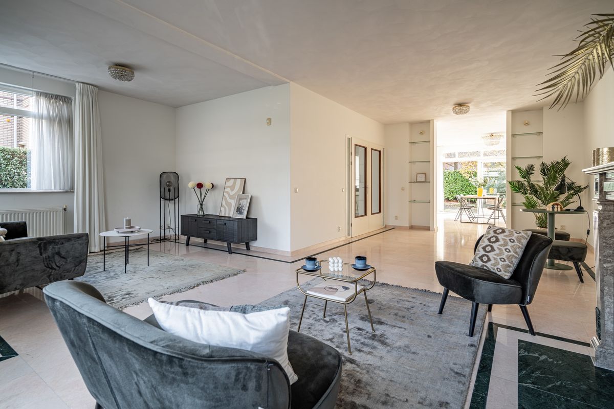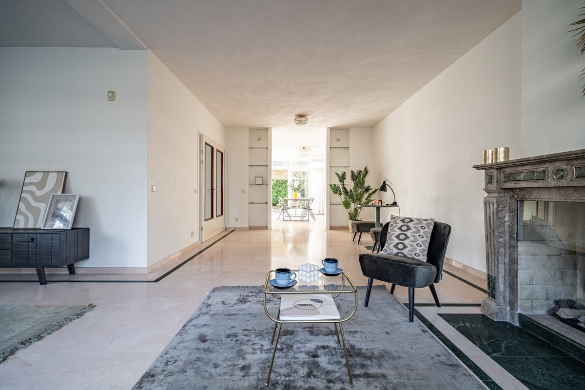 Main entrance to the house on the side. Spacious hall with toilet. Double doors to the living room. Exceptionally spacious living room with L-shaped front room (approx. 8.7 x 6.9 / 3.9 m) with full-wide seating area with a design fireplace and lots of windows for lightening. The rear room (approx. 5.5 x 3.9 m) has a sliding door to the backyard and a doorway to the half open kitchen. Spacious modern open kitchen with U-shaped kitchen layout richly equipped with built-in appliances. Spacious backyard towards the southeast with plenty of sun hours with terrace area. The garage is also accessible from the garden.