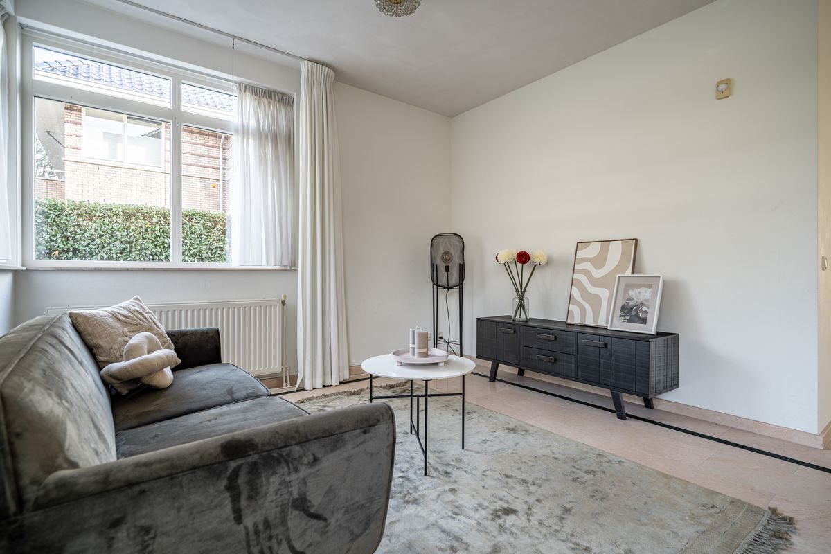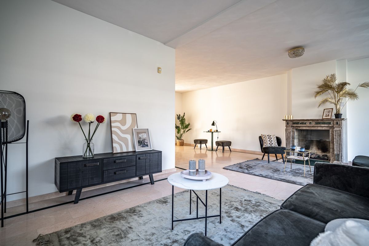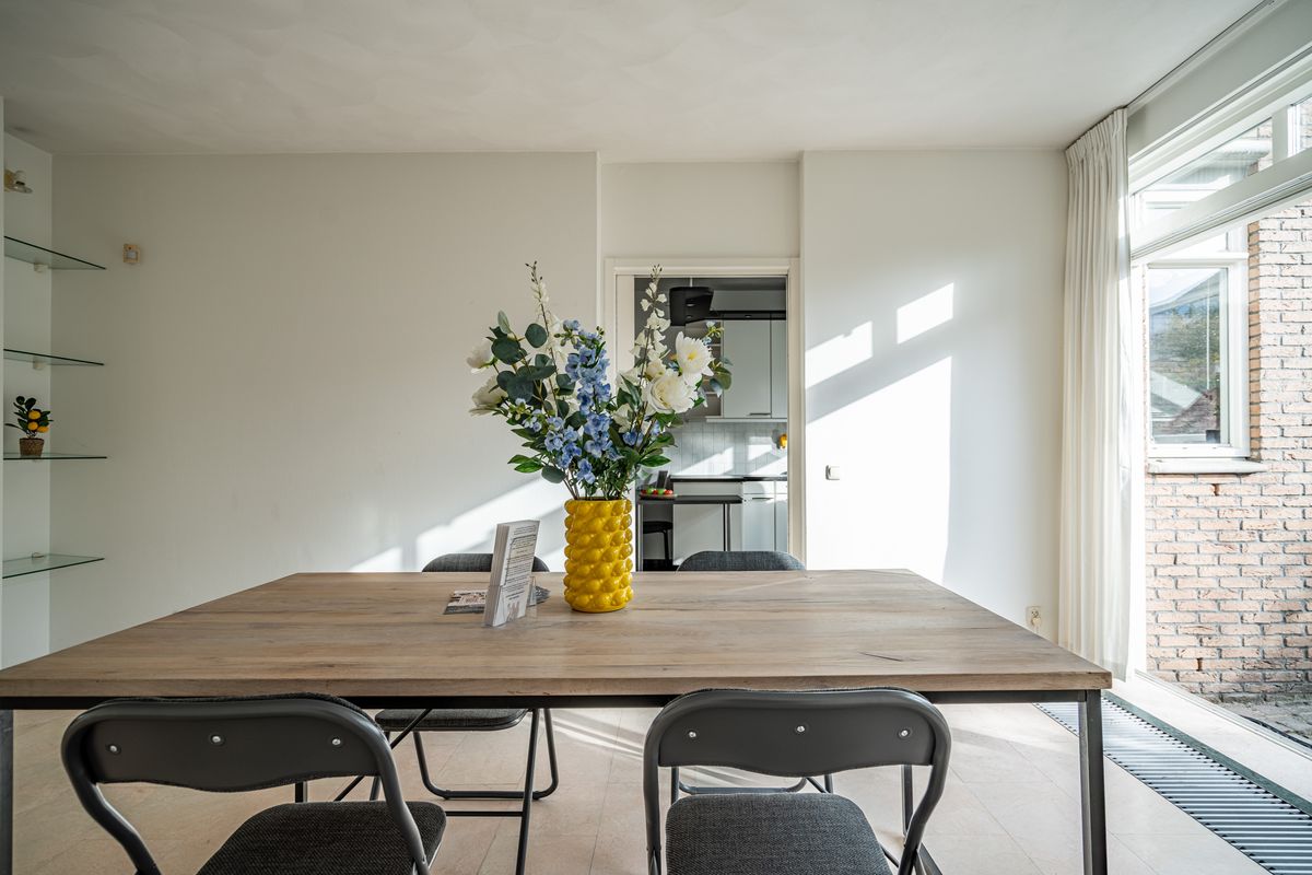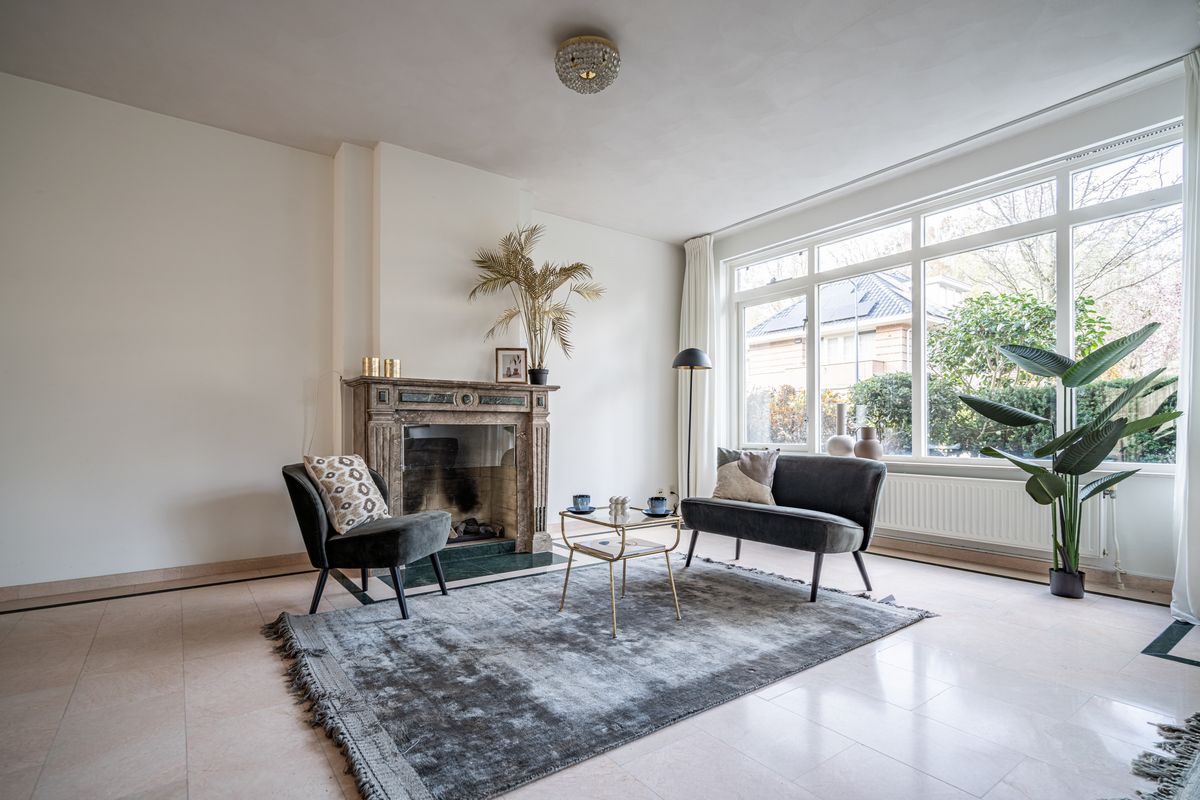 Heerlijk ruime woonkamer met L-vormige voorkamer (ca. 8,7 x 6,9/3,9 m) met zitgedeelte over de gehele breedte aan de voorzijde voorzien van een sfeervolle openhaard en veel raampartijen ten behoeve van de lichtinval. Een versmalling biedt toegang tot de achterkamer. De achterkamer (ca. 5,5 x 3,9 m) heeft een grote schuifpui naar de achtertuin en een doorloop naar de semi-open keuken.