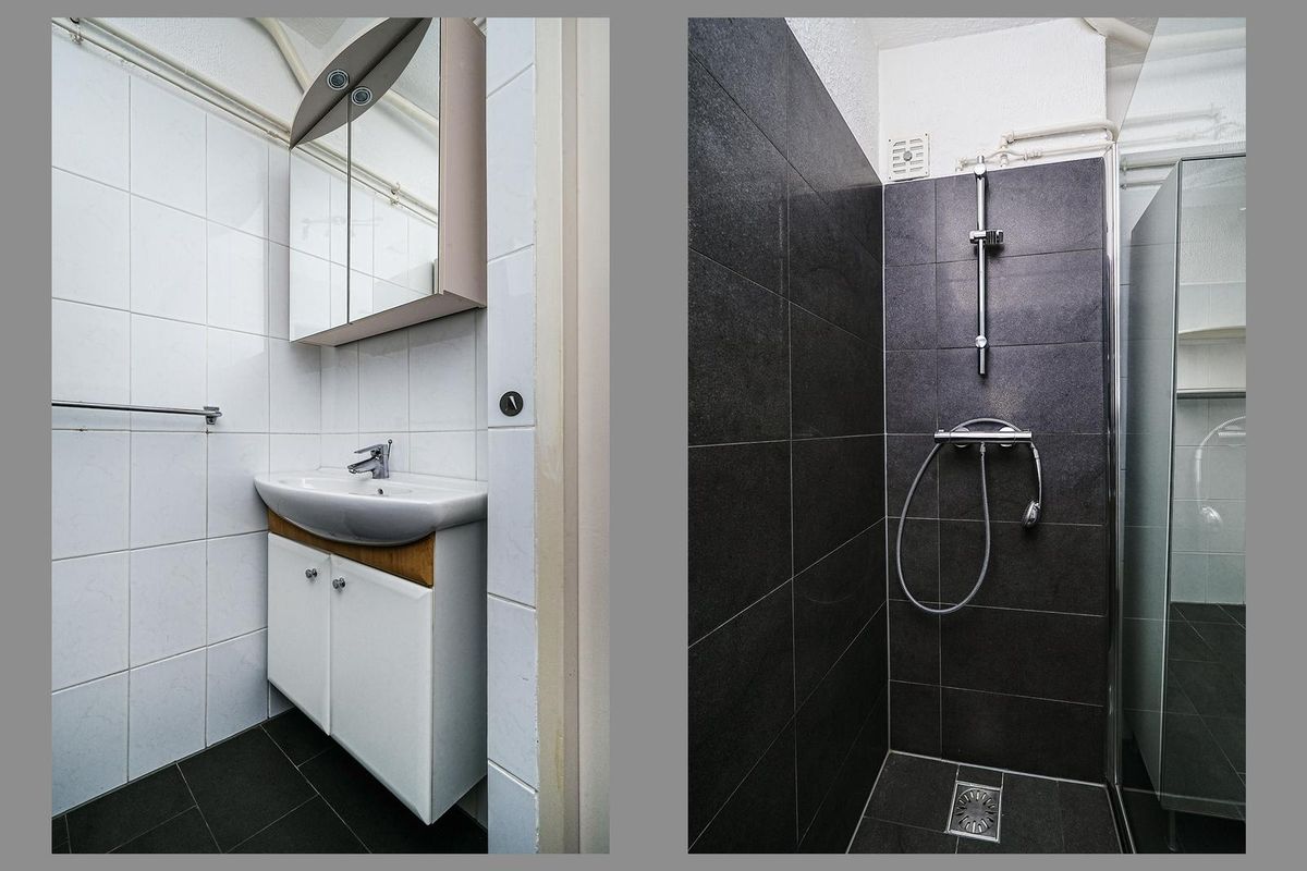 * De geheel betegelde badkamer is voorzien van een ruime inloopdouche en een wastafel.