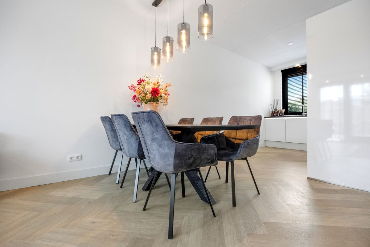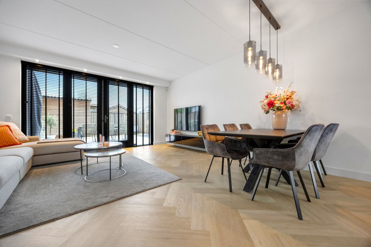 Je komt de woning binnen in de frisse entree met aan je linkerhand de praktische meterkast, het separaat toilet en de trap naar boven. De afwerking op de begane grond is hoogwaardig: een visgraat pvc-vloer met vloerverwarming geeft de leefruimte een warme en luxueuze uitstraling. De woonkamer is een grote open ruimte met aan de aan de voorzijde de moderne keuken, middenin plek voor een grote eettafel met 6 stoelen en aan de achterzijde het zitgedeelte.