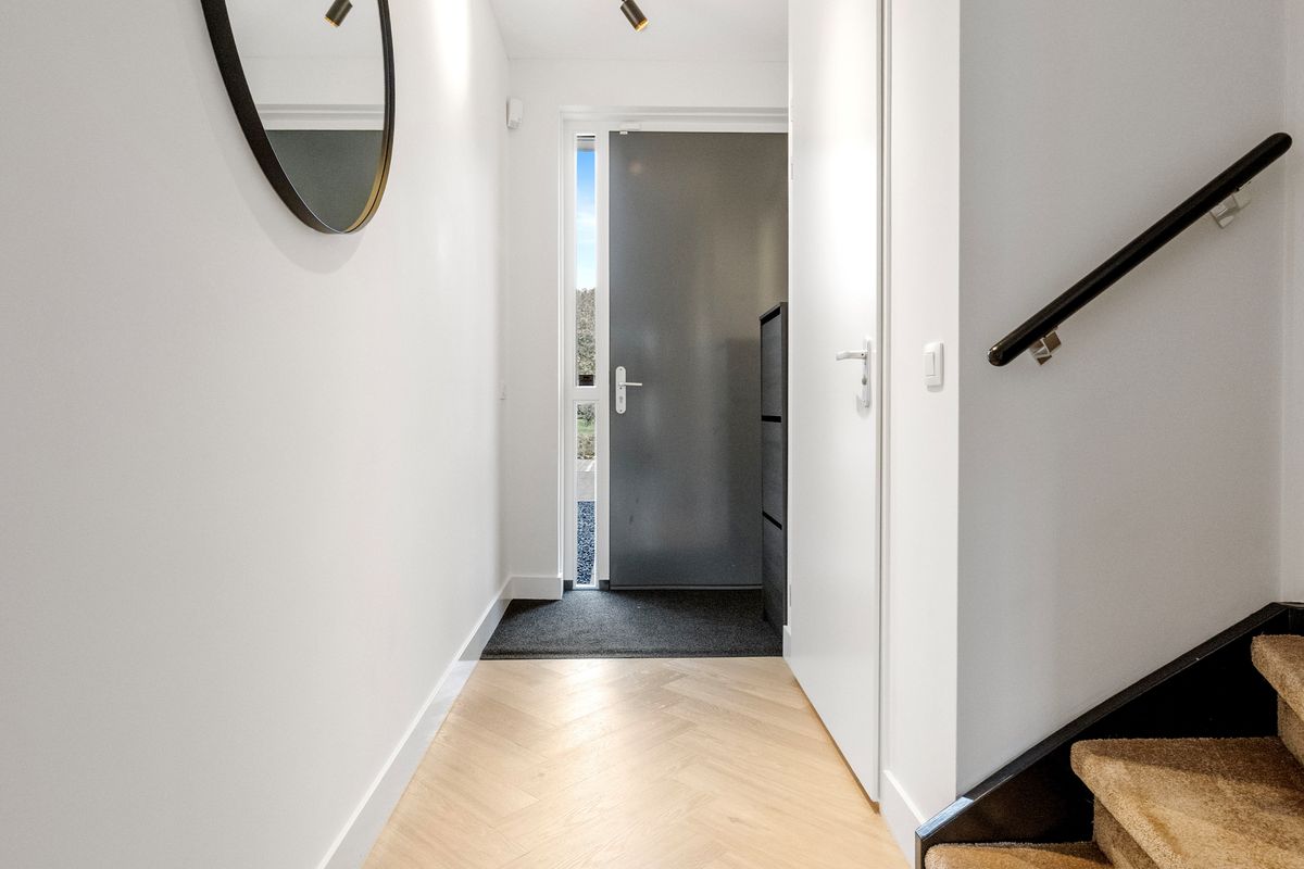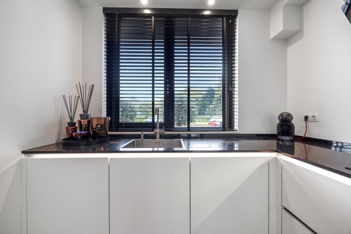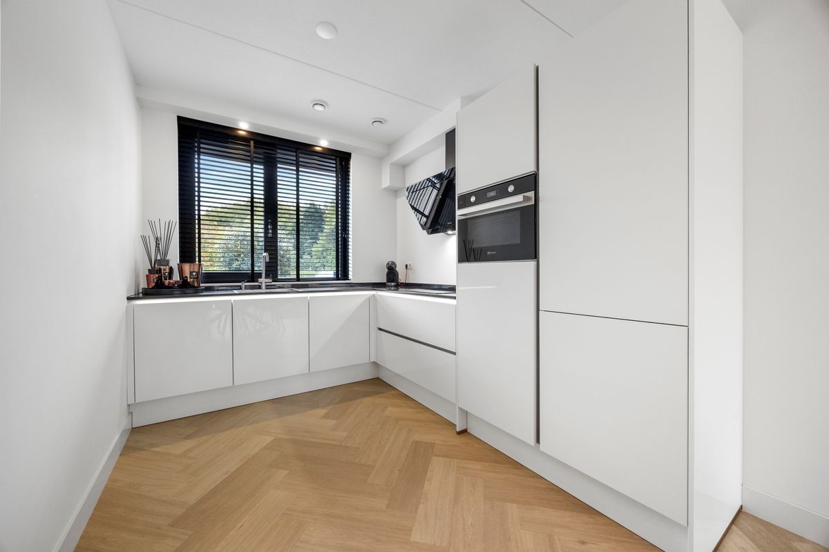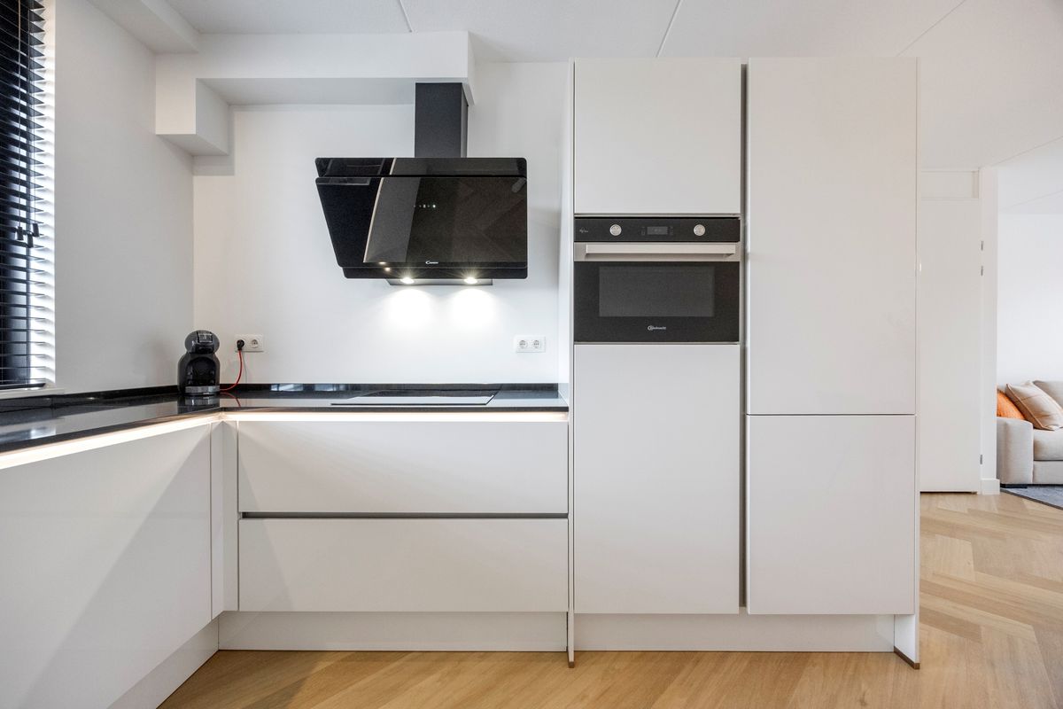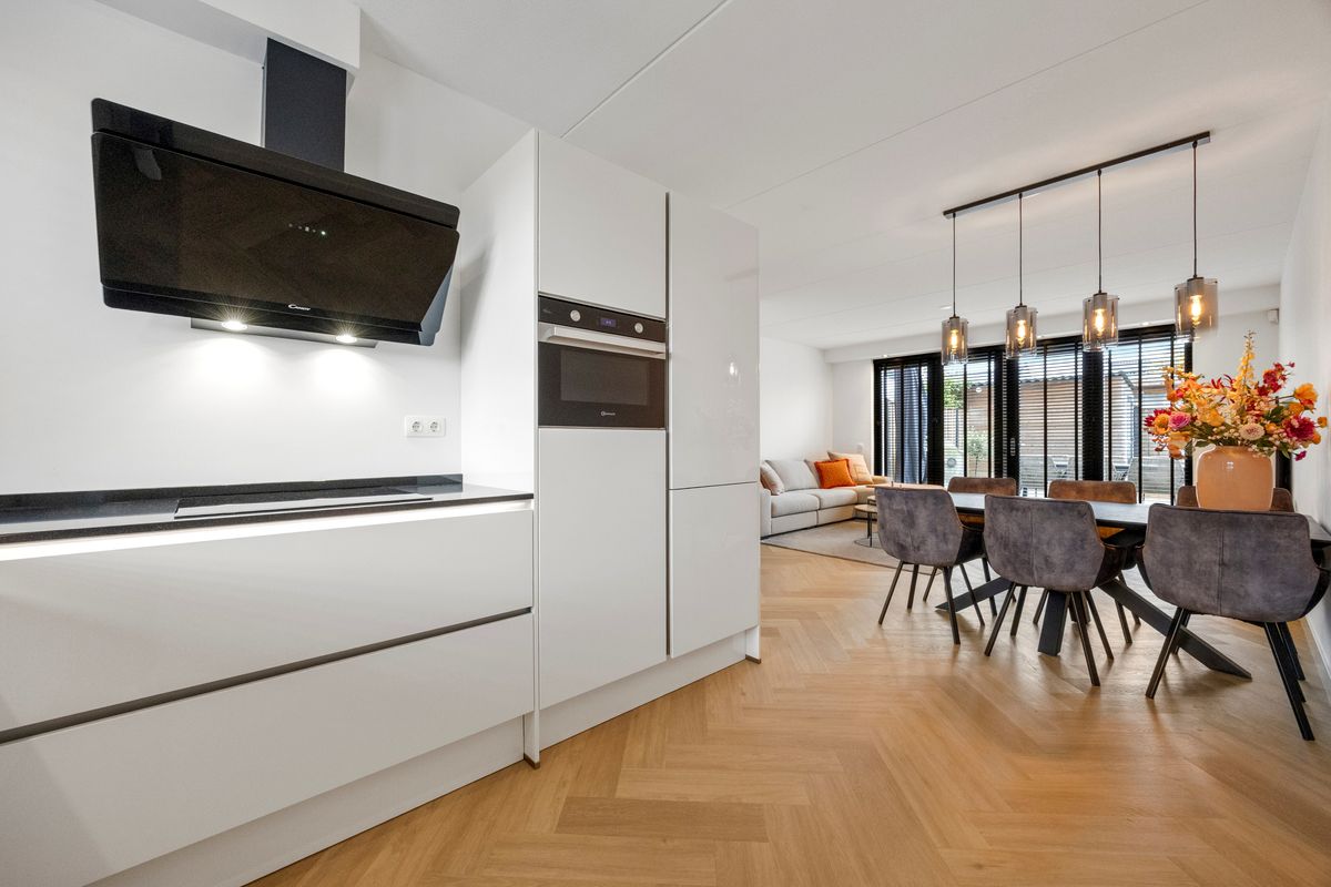 Vanuit de keuken heb je een ruim uitzicht op het groen. De keuken is stijlvol en goed doordacht: een 4-pits inductiekookplaat met afzuiging, combi-oven/magnetron, koel-vriescombinatie en vaatwasser maken koken moeiteloos. Modern vormgegeven in wit met zwarte accenten, afgewerkt met een inbouwspotjes en voorzien van mechanische ventilatie. De keuken combineert functionaliteit met comfort, met voldoende opbergruimte voor al je keukengerei. Direct naast de entree is ook nog een handige trapkast voor extra opbergruimte.