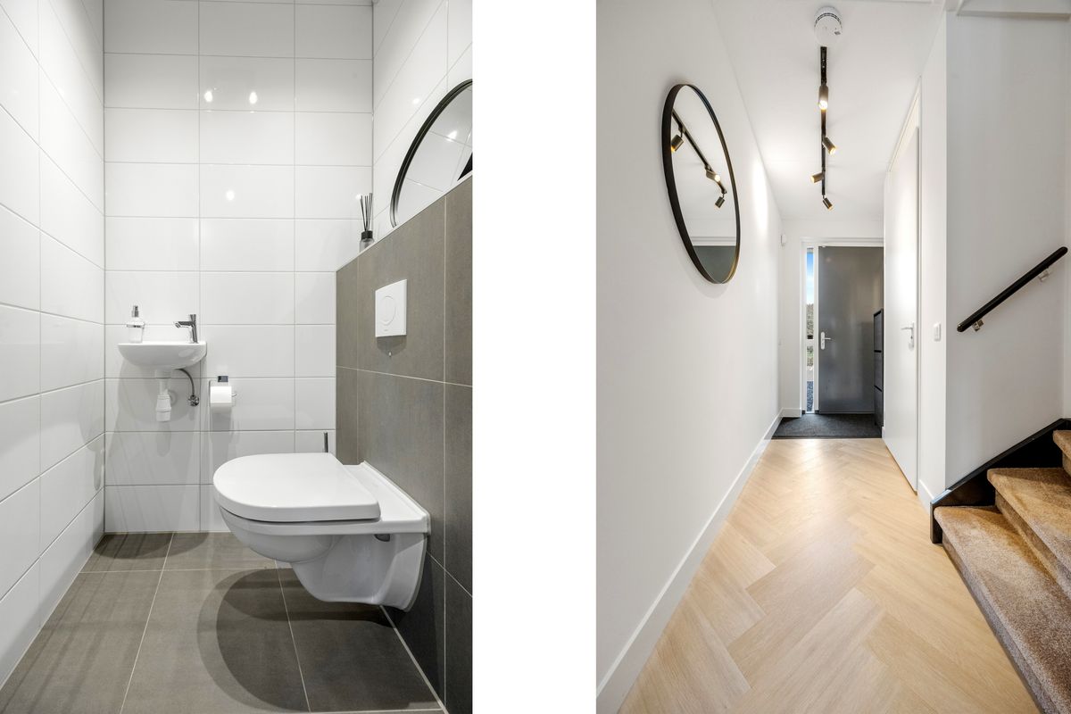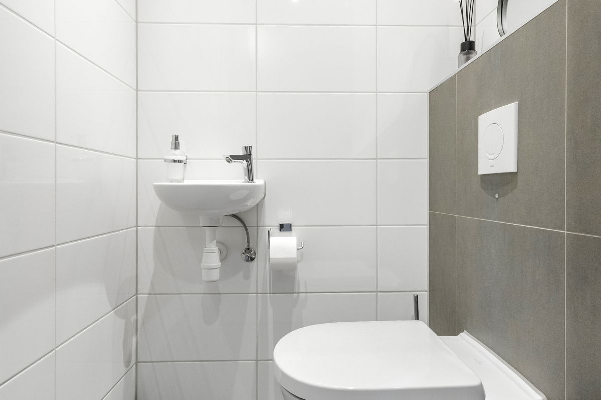 Op de eerste verdieping bevinden zich drie slaapkamers en een verzorgde badkamer. De kleinste kamer doet nu dienst als inloopkast, maar kan ook ingericht worden als thuiswerkplek, hobbykamer of kinderkamer. De grootste slaapkamer vinden we ook aan de achterzijde en is royaal van formaat, met voldoende ruimte voor een ruim tweepersoonsbed en een kledingkast. Omdat de woning op een hoek gelegen is, is er in deze slaapkamer een extra zijraam waardoor er veel lichtinval is. Deze slaapkamer is bovendien uitgerust met een airco die zowel koelt als verwarmt, waardoor je het hele jaar door van optimaal comfort geniet. Aan de voorzijde van de woning vinden we de middelste kamer. Deze slaapkamer heeft eveneens een fijne lichtinval en is uitermate geschikt als kinderkamer of werk/logeerkamer. De badkamer past perfect bij de rest van het huis: strak, frist en functioneel met een moderne afwerking. De badkamer is voorzien van een wastafel met meubel en een hoge kast er naast, een comfortabele douchecabine en een zwevend toilet. Dankzij het raam is er prettig daglicht en natuurlijke ventilatie.