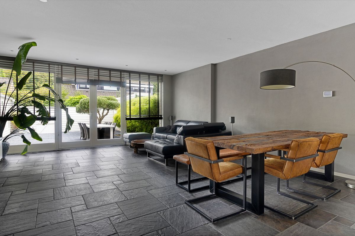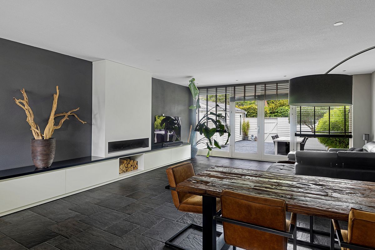 De uitgebouwde woonkamer is tuingericht en uitgevoerd met een grote glaspartij, een fraaie stenen vloer met vloerverwarming én een wandmeubel met sierhaard die werkt via schermtechniek (uitleg volgt tijdens de bezichtiging). Dit zorgt voor een sfeervol geheel.