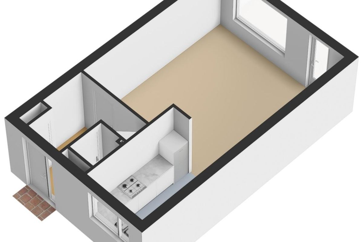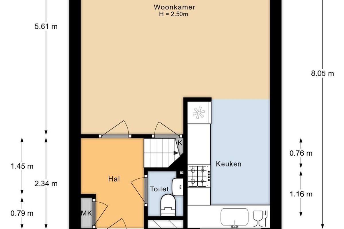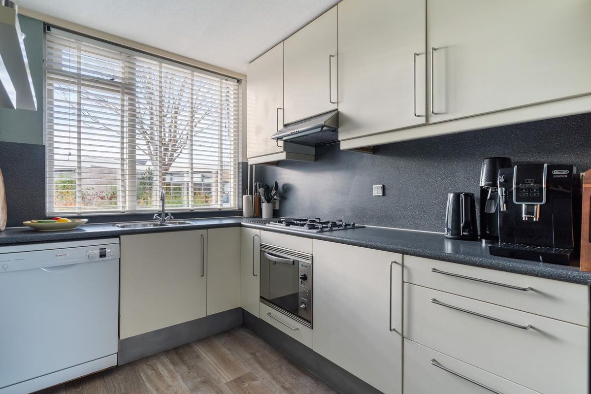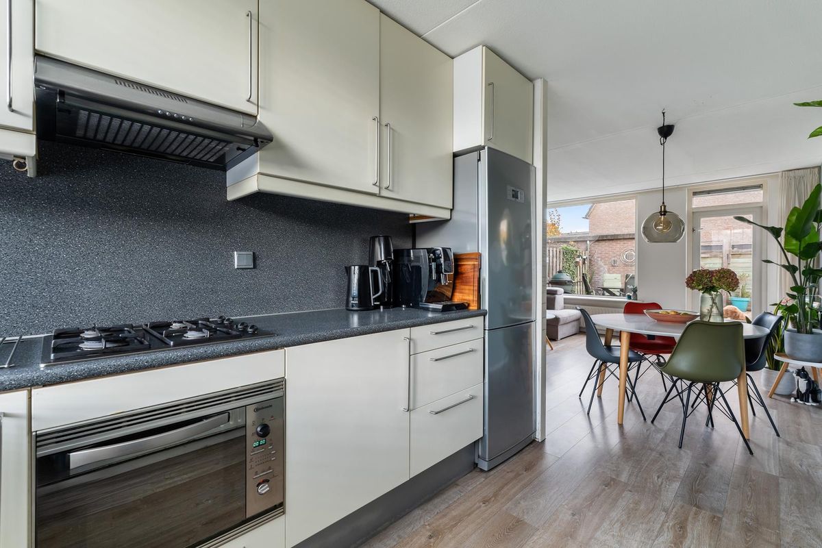 De keuken ligt aan de voorzijde van de woning en is praktisch ingedeeld in een L-vormige opstelling. Deze is voorzien van een gaskookplaat, afzuigkap, oven, vaatwasser en koel-vriescombinatie. Door het brede raam met lamellen valt veel natuurlijk licht naar binnen, wat de keuken een open en frisse uitstraling geeft.