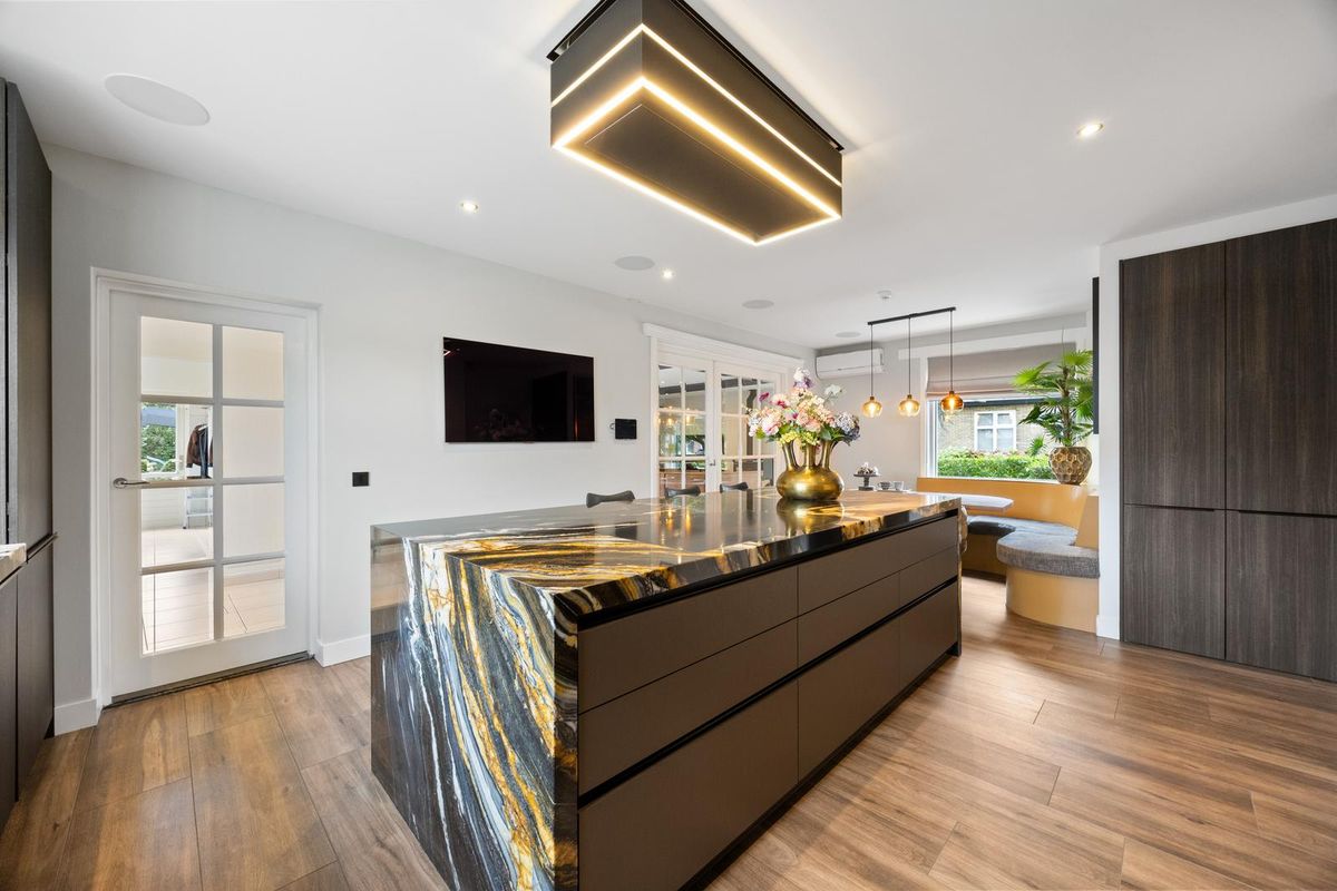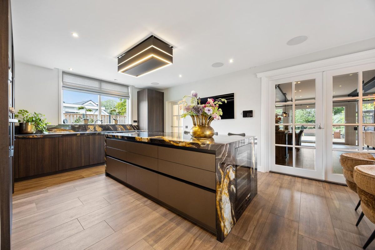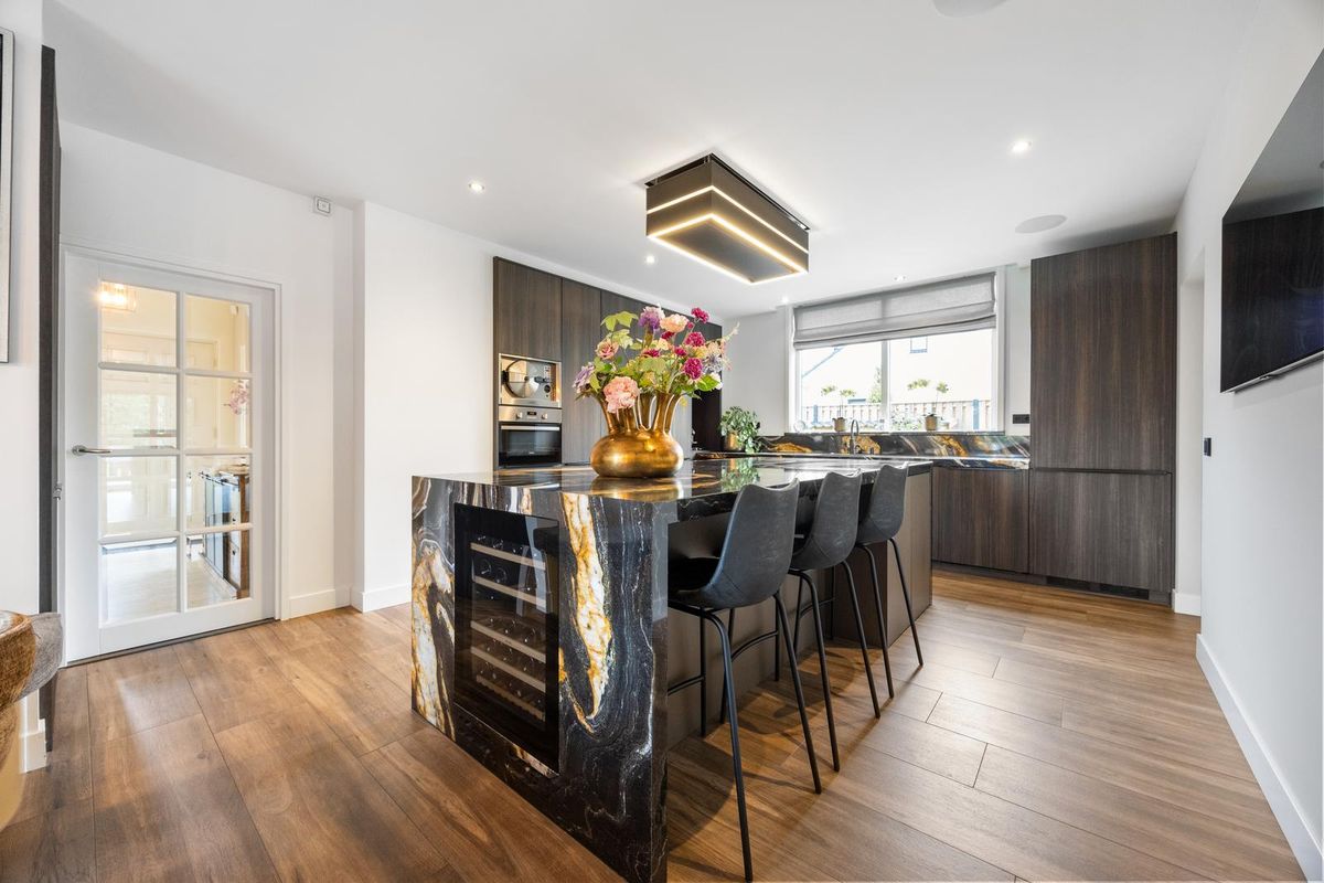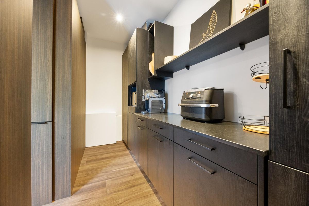 Begane grond: voortuin, overdekte entree. Ruime hal met trapopgang (2 bordessen), toilet (met wandcloset, metalen fontein, toiletraam ). Begane grond (kantoor)kamer aan de voorzijde. Woonkeuken met vaste hoekbank bij het raam naar de voortuin. Gebruikmakend van high-end materialen en apparatuur is de luxe keuken uitgevoerd met: een groot kookeiland met slimme inductiekookplaat (ATAG Celsius° Cooking, 6 warmtezones), op afstand bedienbare re- circulaire plafondafzuigkap (hoogte instelbaar, Permalyt filter), bar (plek voor 3 krukken) en wijnkoeler geïntegreerd in de zijkant van het natuurstenen werkblad. Daarnaast zijn er een vaatwasser, gootsteen met kokend- en bruiswaterkraan (Quooker), combioven, stoomoven en veel bergruimte beschikbaar. Verrassend is de achter openslaande keukendeuren schuilgaande pantry. Behalve veel bergruimte zijn hier een extra koelkast en grote diepvries aanwezig. Vaste keuken- bergkast onder de trapopgang.