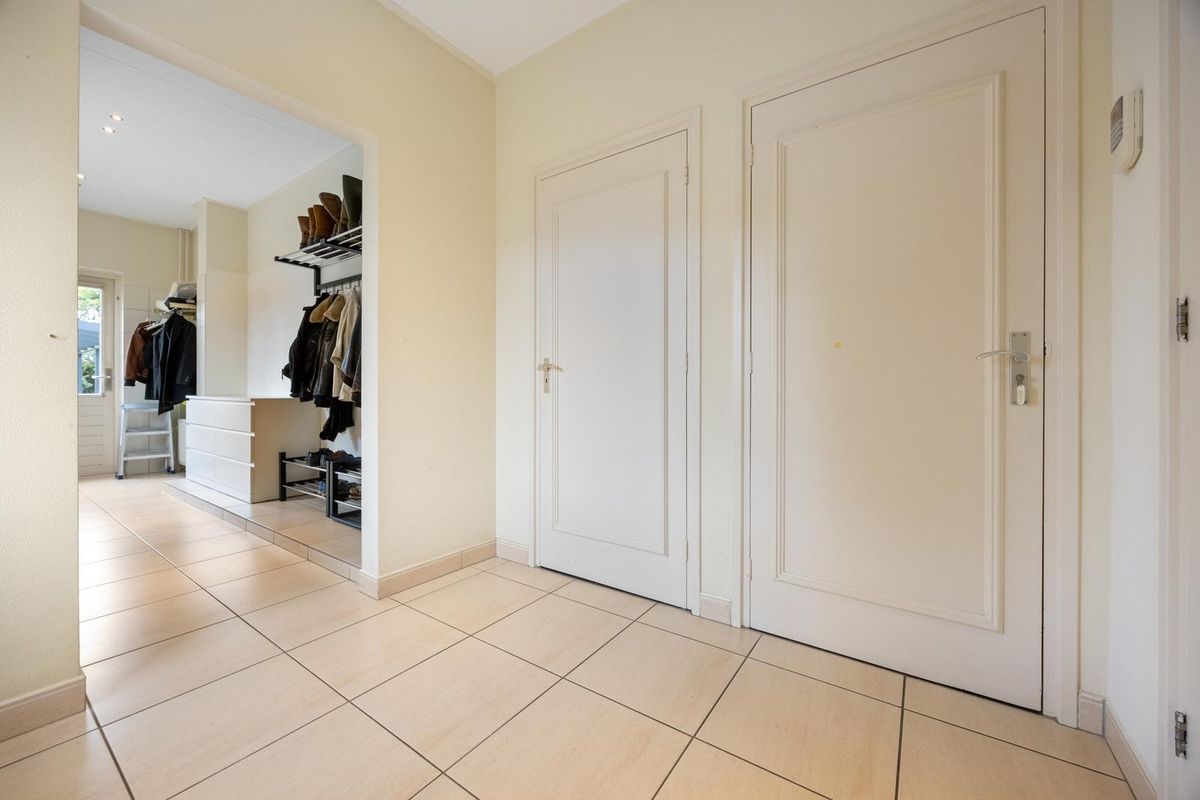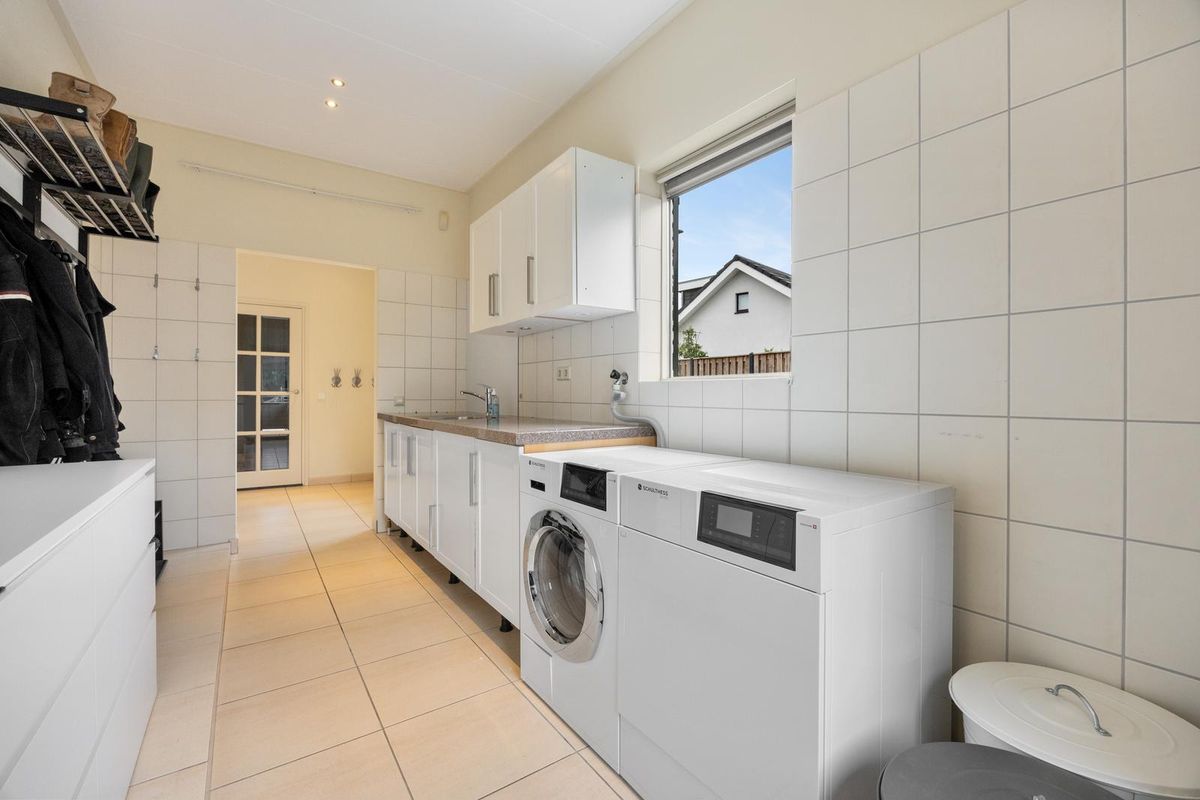 Openslaande deuren naar de zeer grote woonkamer met houtkachel, voorzien van schuifpui naar de achtertuin. Vanuit de keuken deur naar de hal aan opritzijde, met garderobe, meterkast/technische ruimte. Deur naar de kelder. Bijkeuken met keukenopstelling (met spoelbak) en aansluitingen voor wasmachine en droger, deur naar de achtertuin.