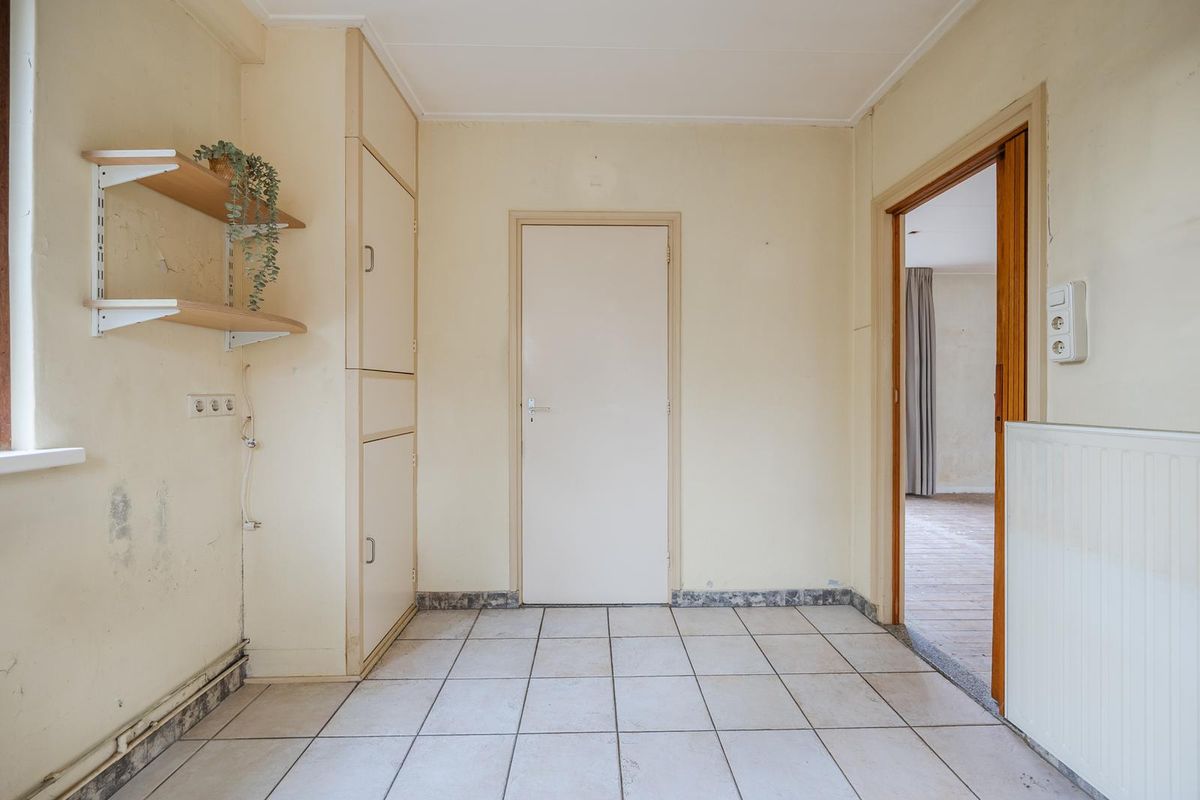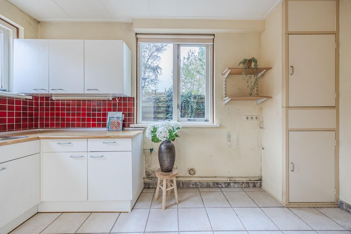 De leefkeuken met tegelvloer is eenvoudig van opzet. Vanuit de keuken heeft u toegang tot de achterdeur. Via de keuken heeft u zicht op de achtertuin.