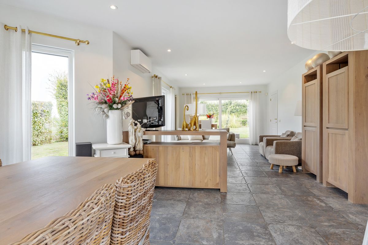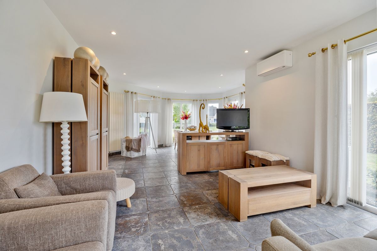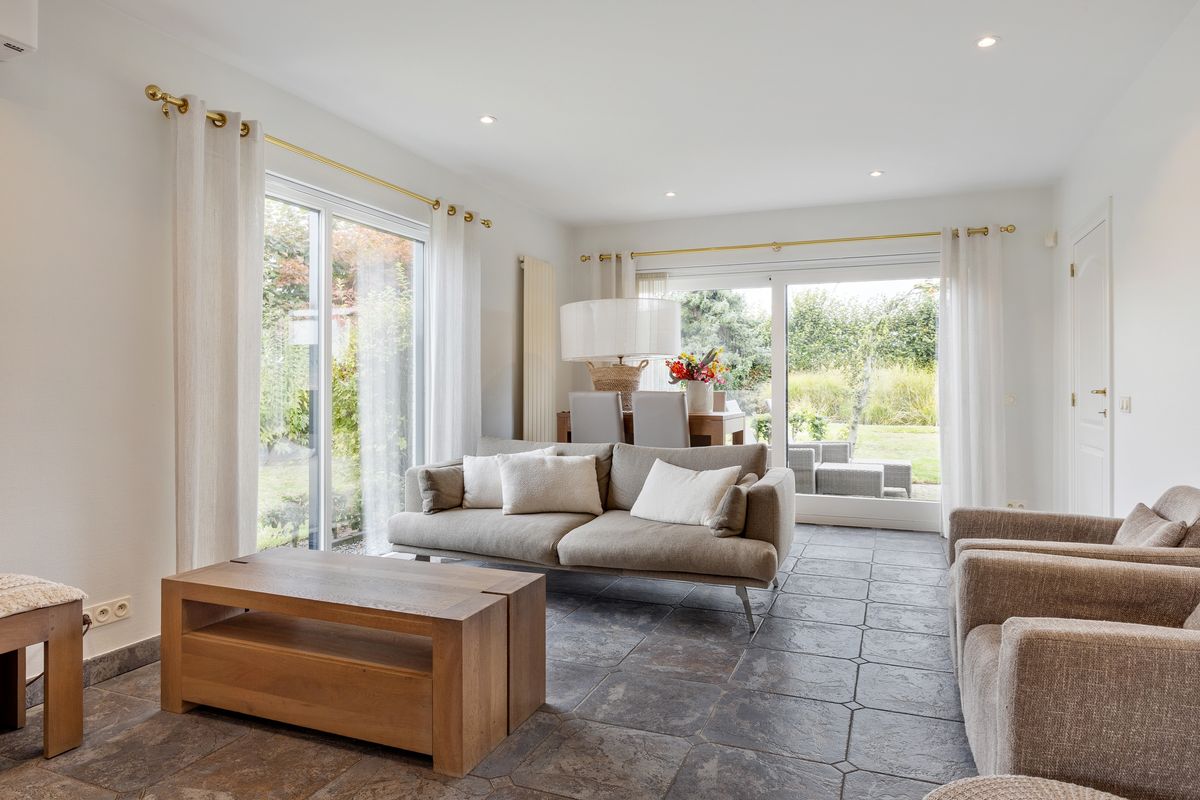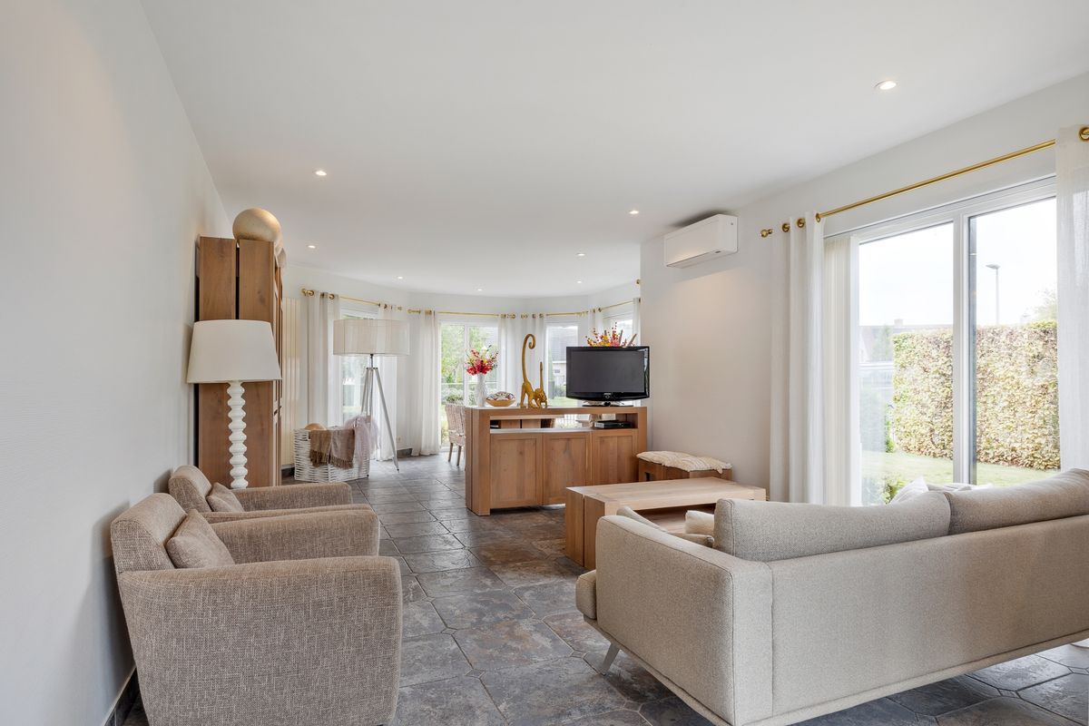 De woonkamer is voorzien van een tegelvloer, glad gestucte wanden en plafonds, inbouwverlichting, een airco en een schuifpui voor direct toegang tot het terras. Vanwege de grote raampartijen is dit een aangename leefruimte met veel daglichttoetreding.