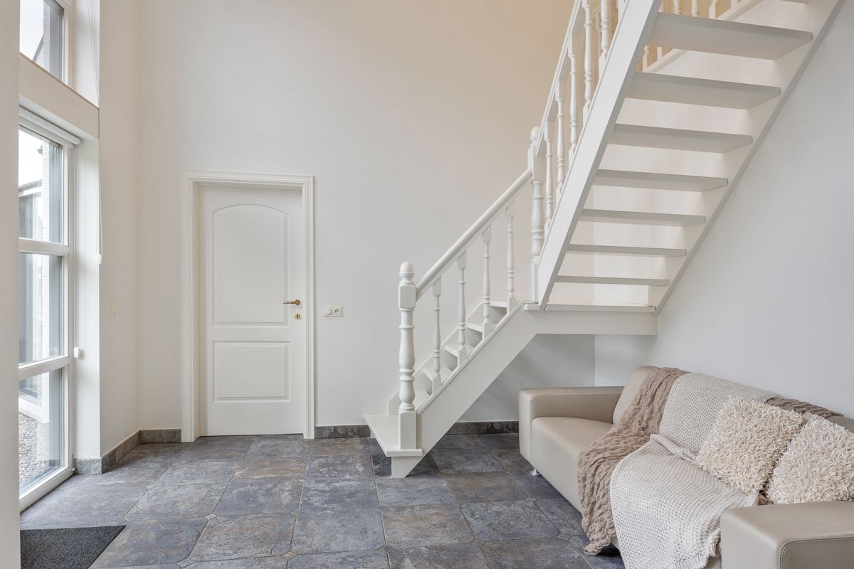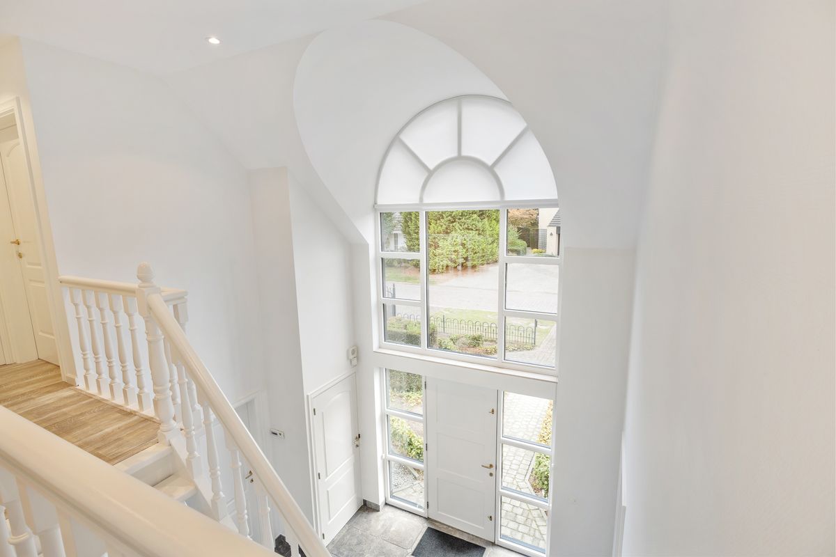 Middels de keurig aangelegde voortuin met een oprit voor meerdere voertuigen bereikt u de entree van de woning. Bij binnenkomst valt direct de hoeveelheid daglichttoetreding op. De riante entreehal is voorzien van een tegelvloer, trapopgang voor toegang tot de verdieping, een garderobe, een toiletruimte, een meterkast en biedt toegang tot een werkkamer/hobbykamer en de woonkamer.