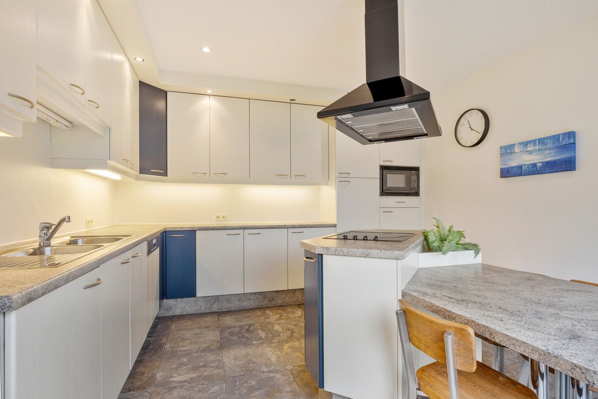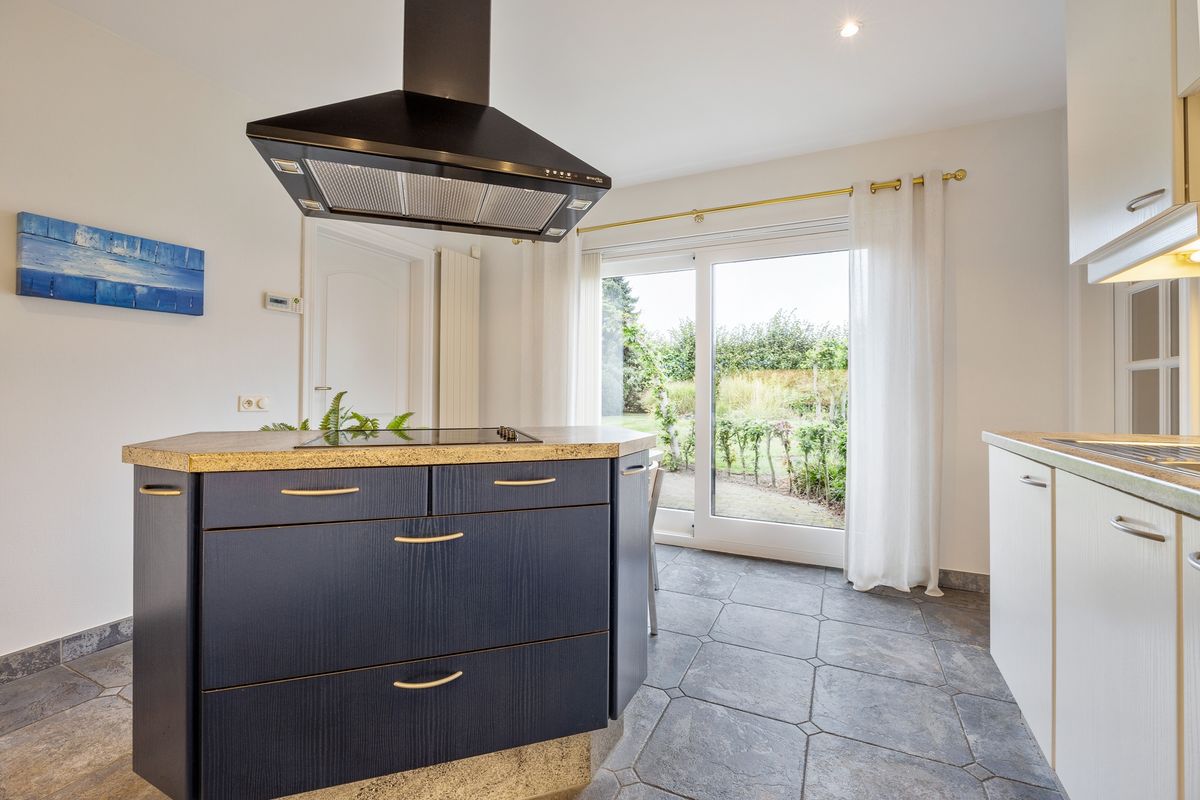 De afgesloten leefkeuken is geplaatst in een hoekopstelling met een kookeiland en zitje met plaats voor 4 stoelen. De keuken is voorzien van een keramische kookplaat, een afzuigkap, een dubbele spoelbak, een vaatwasser, een koelkast, een combi-oven en diverse kastruimte. Via een schuifpui heeft u direct toegang tot het terras. Aansluitend heeft u via de keuken toegang tot een achterportaal en de bijkeuken.