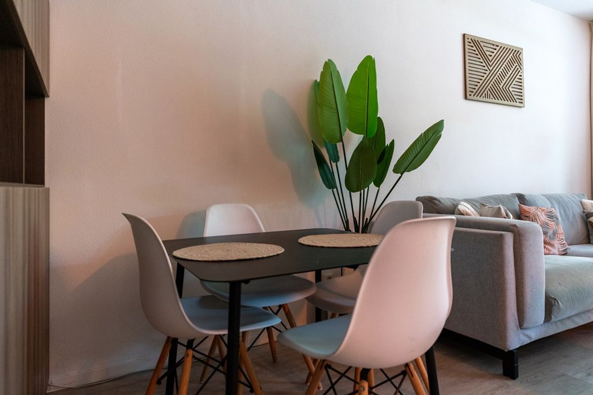 The living room and dining area is fully furnished and equipped with smart TV, internet and sleek wall and ceiling finishes. Also, the living room enjoys lots of light through the large windows and unobstructed views. From the living room, you have access to the sunny balcony. The modern open kitchen where you can enjoy the bar with sink island and is fully equipped. Namely, a 4-burner induction, hob, extractor, oven, fridge freezer, dishwasher and all the inventory you need in the kitchen.