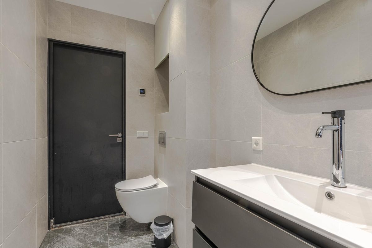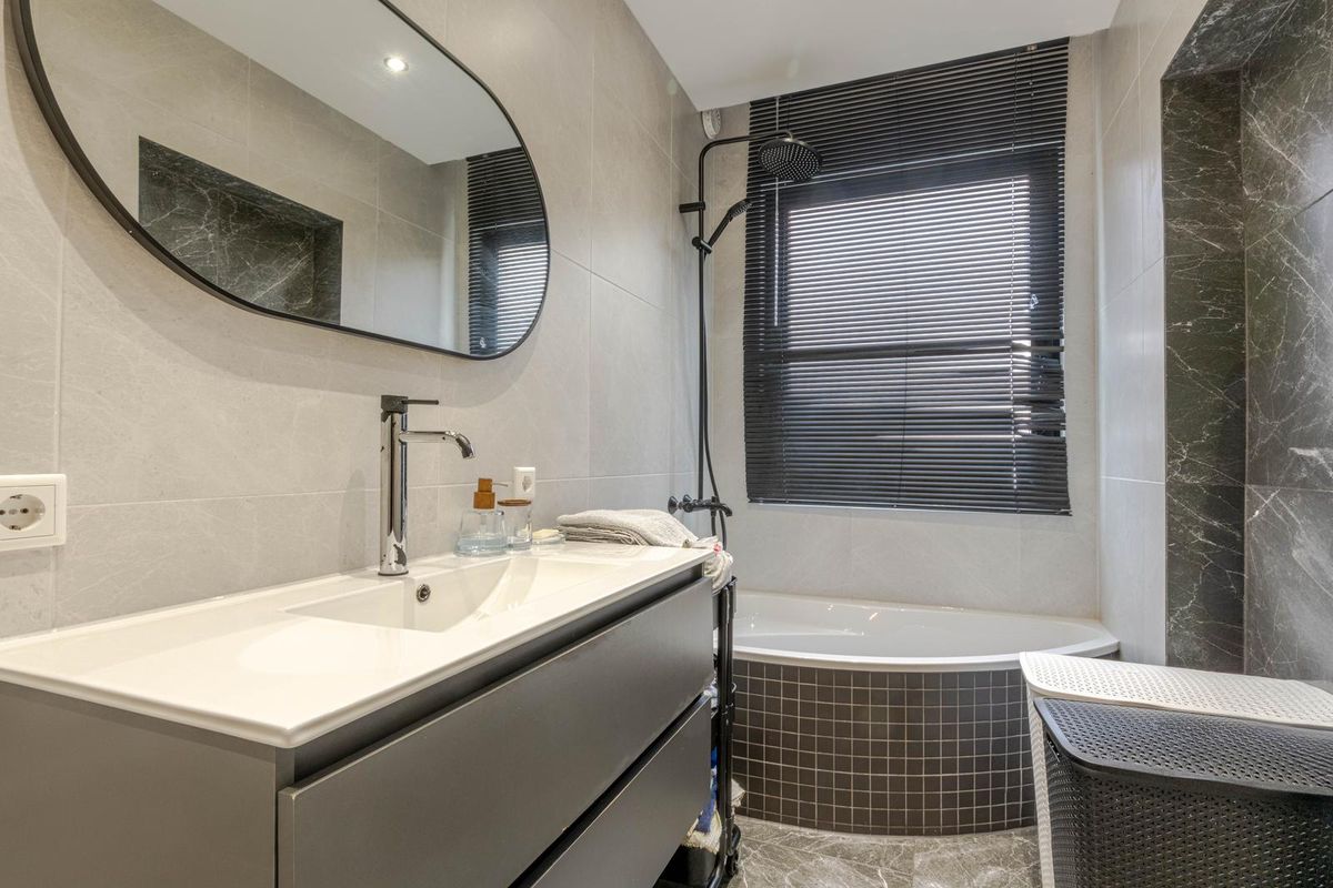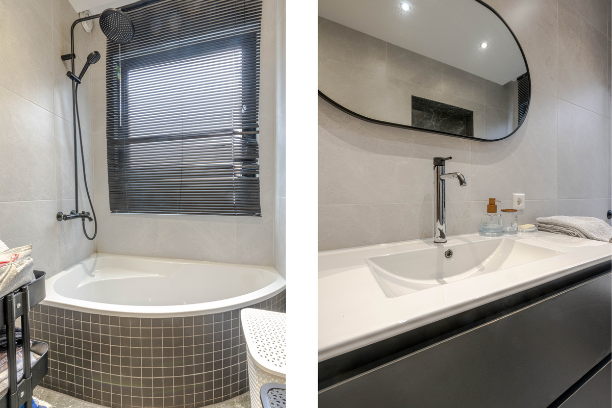 * Badkamer met moderne betegeling, tegelvloer met vloerverwarming, ligbad met regendouche-opstelling, wastafelmeubel, wandtoilet en verlaagd plafond met inbouwspotjes.