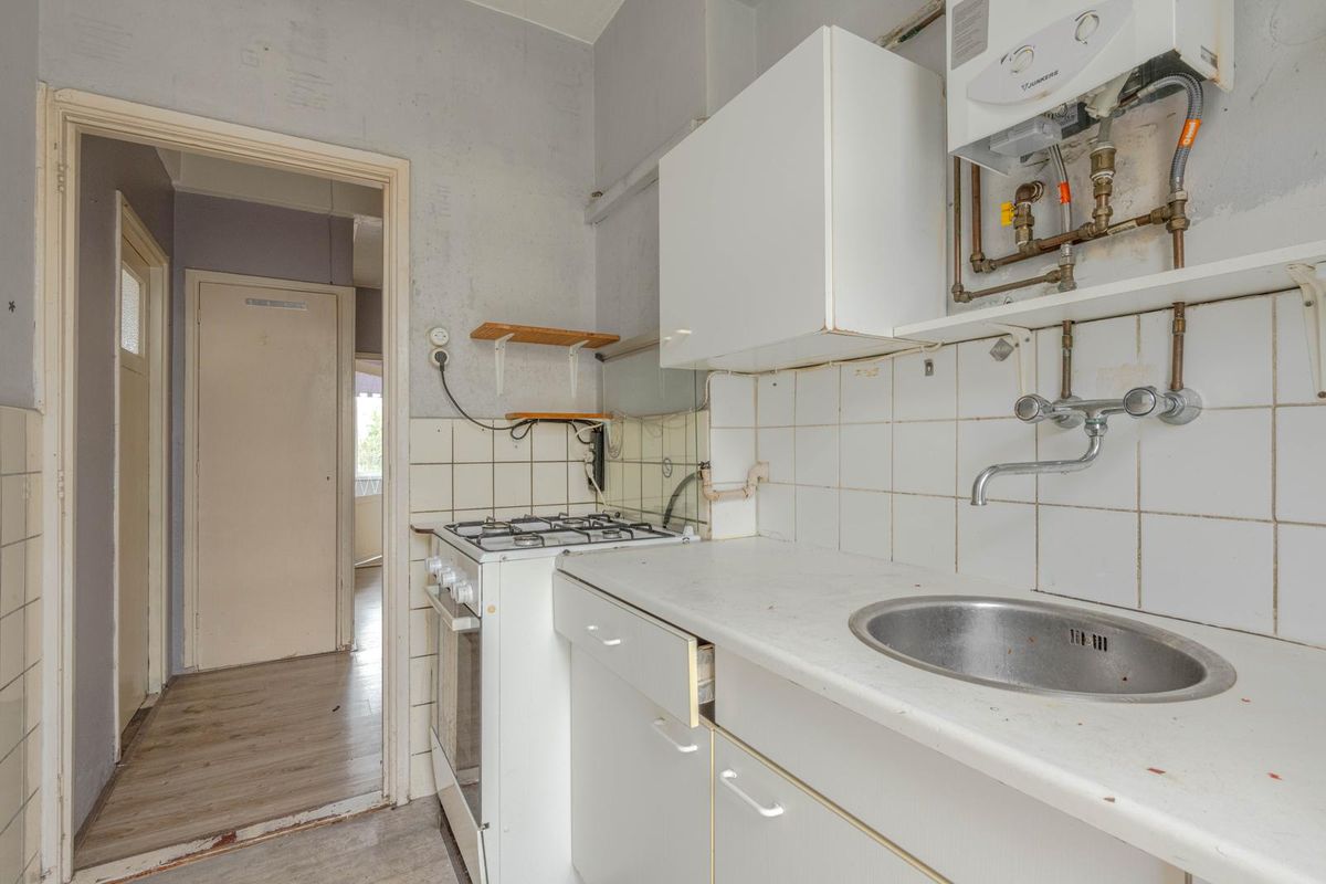 * Keukenruimte voorzien van functionele keukenopstelling met gedeeltelijk betegelde wanden, gasfornuis, geiser en toegang naar het balkon.