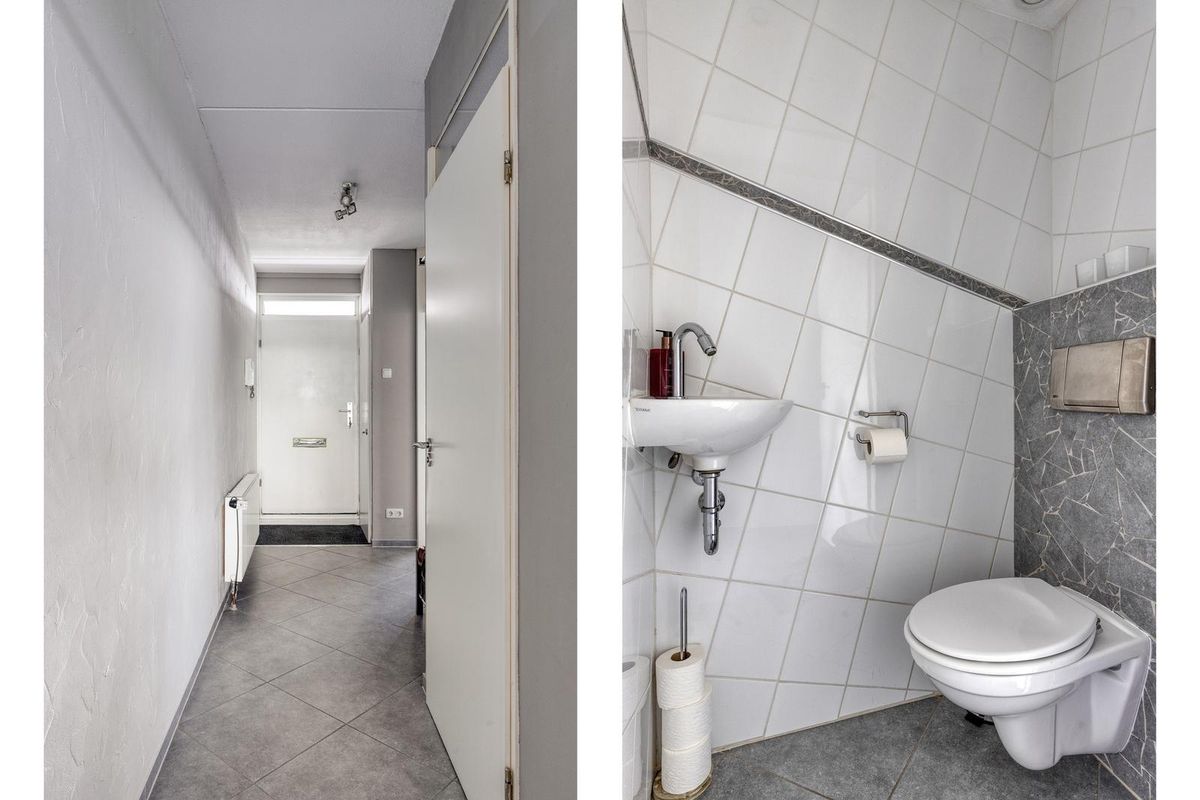 * Galerij, entree, hal met meterkast, toilet met fonteintje.