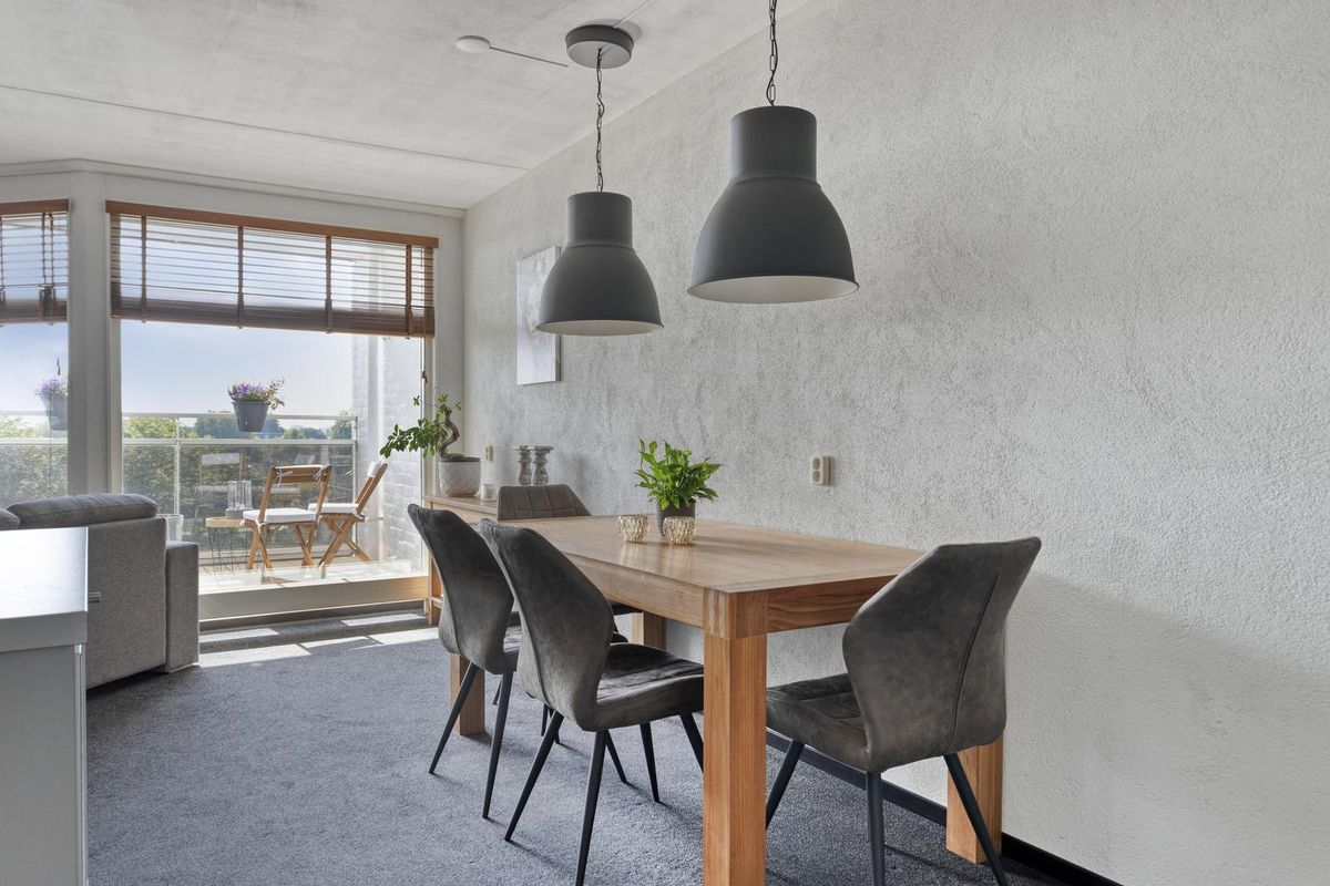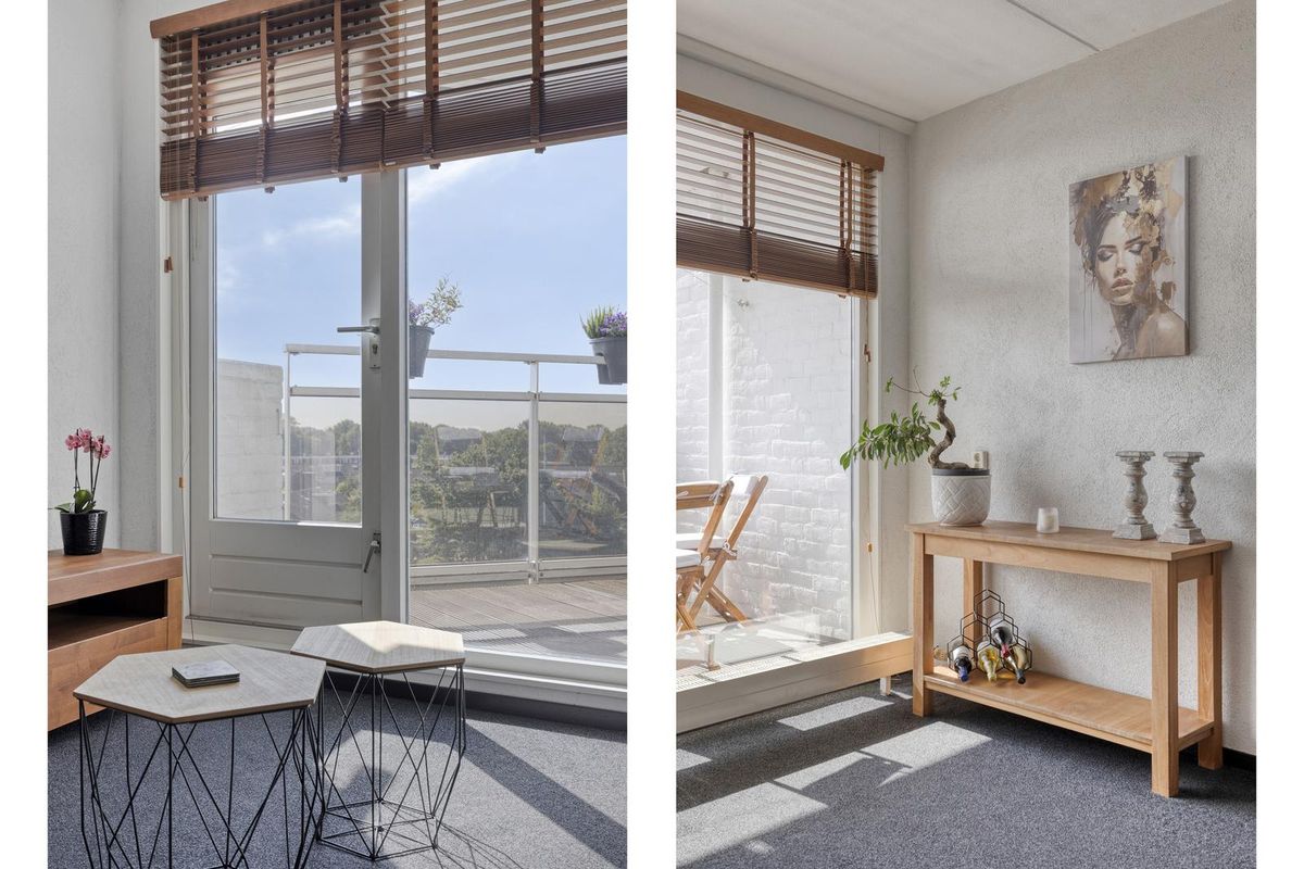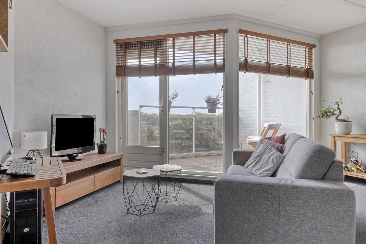 * Woonkamer met veel lichtinval en toegang tot het zonnige balkon met prachtig vrij uitzicht over water en groen.