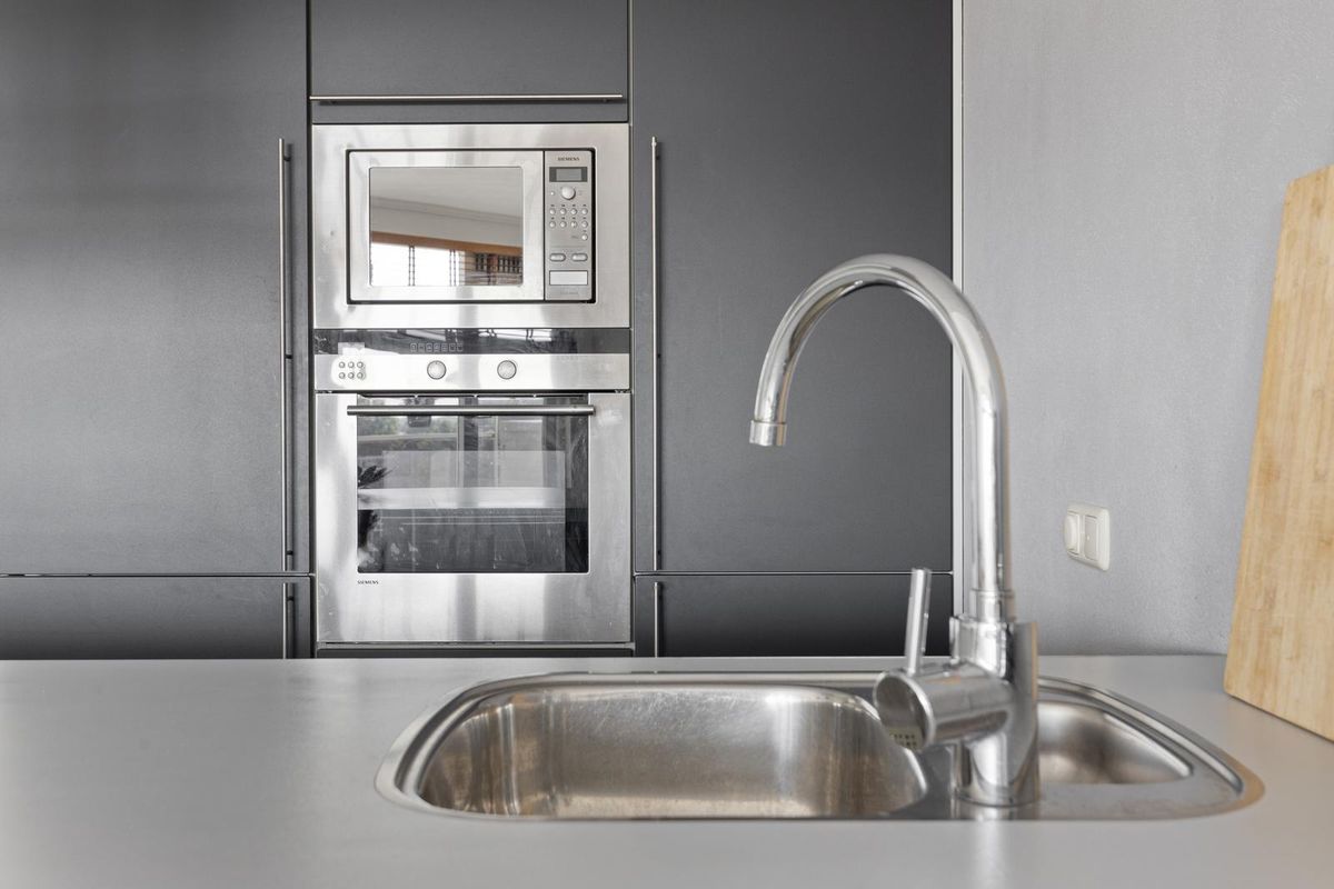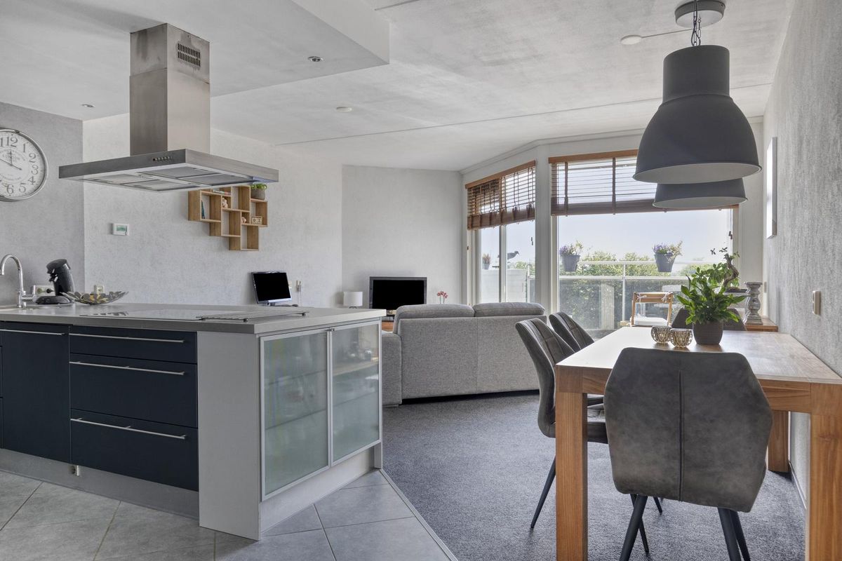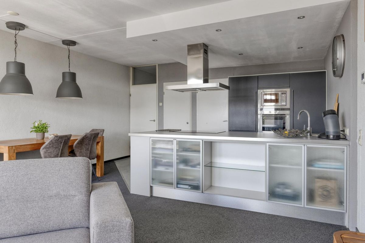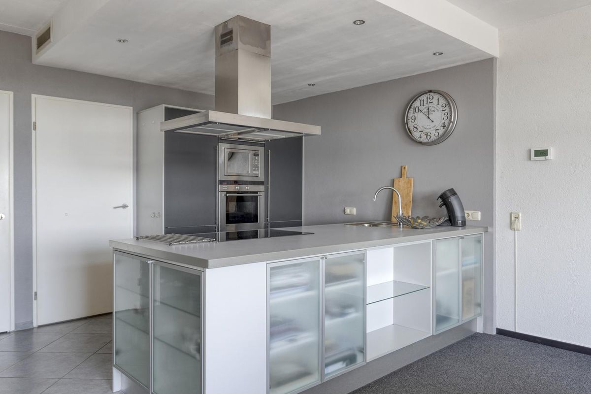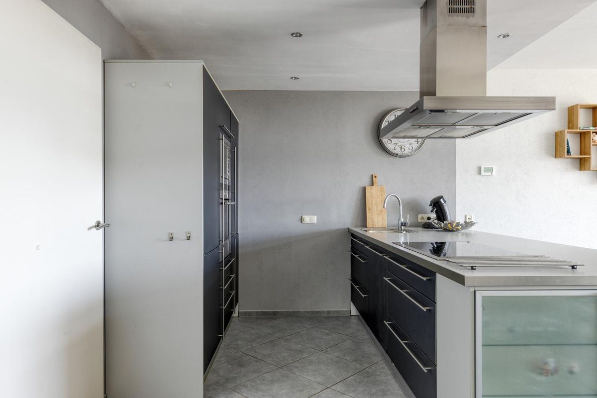 * Open keuken met schiereiland, voorzien van een keramische kookplaat, RVS afzuigkap, vaatwasser, magnetron, oven en koel/-vriescombinatie.