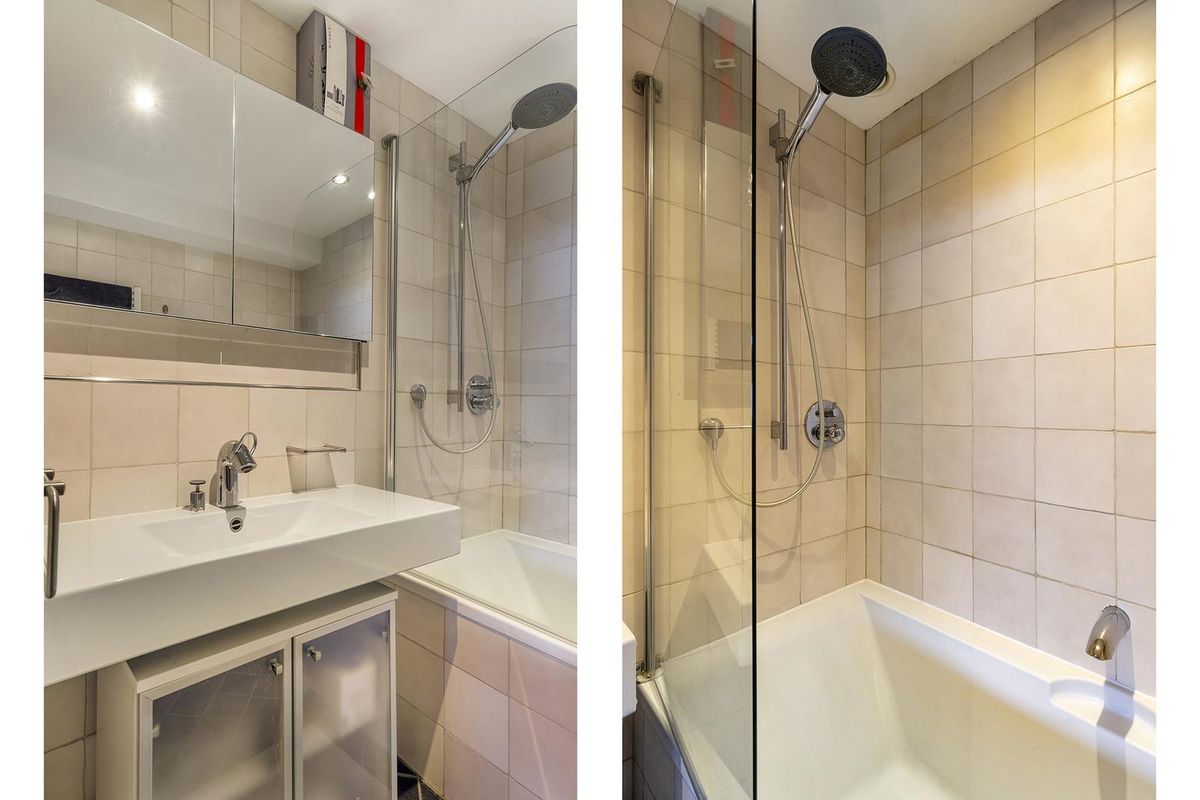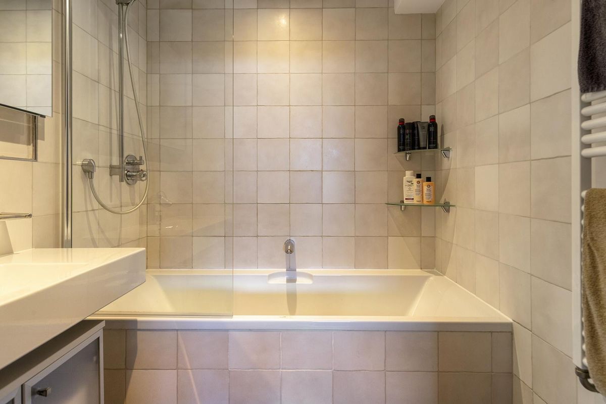 * Badkamer met ligbad met douchefaciliteit, wastafel en designradiator.
