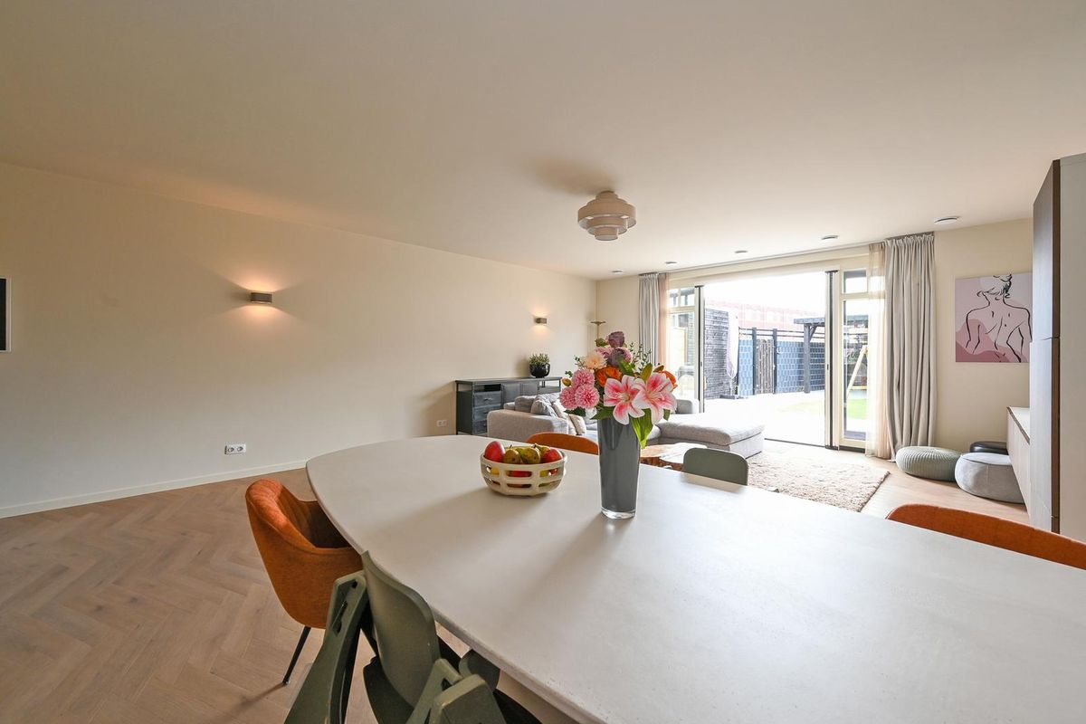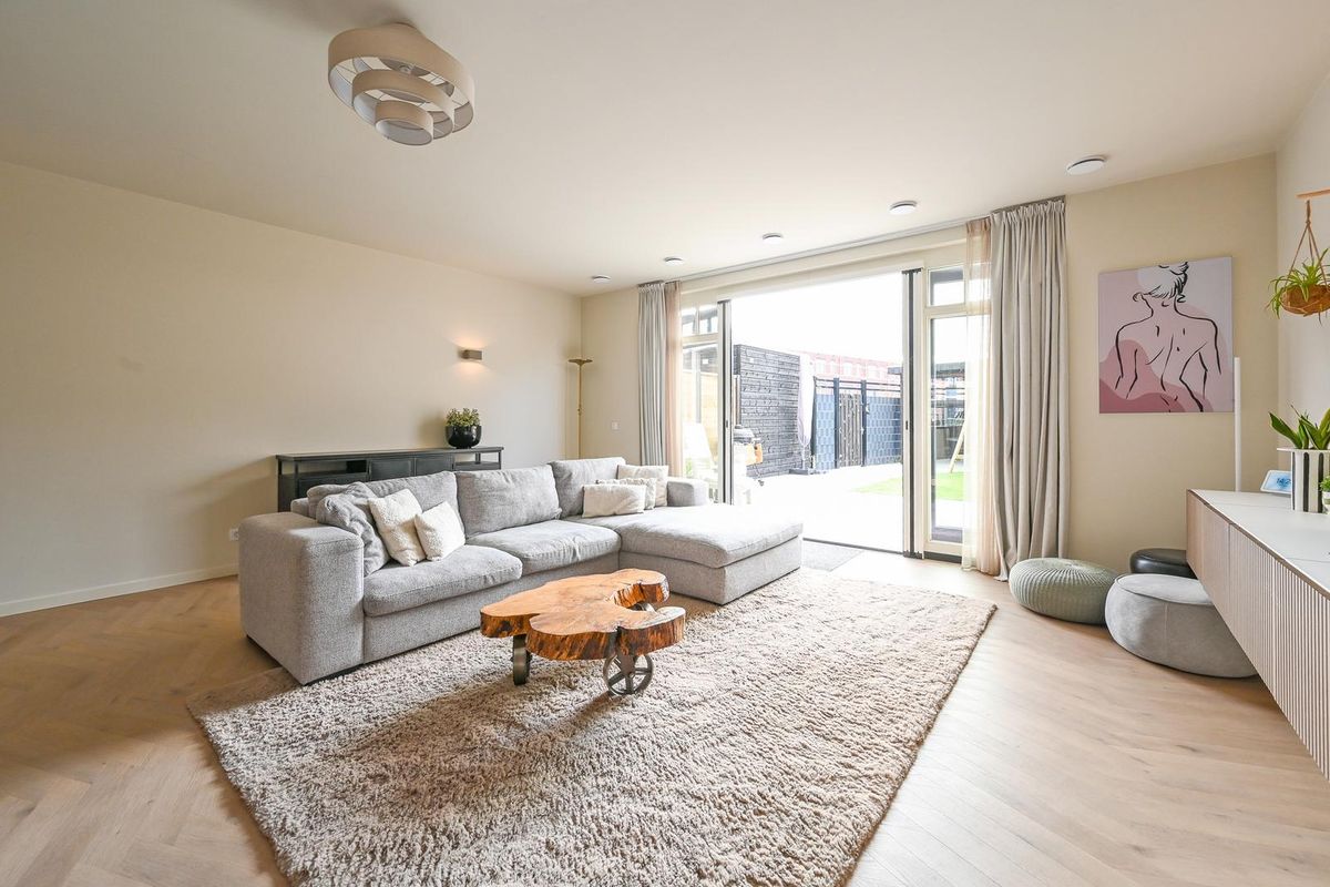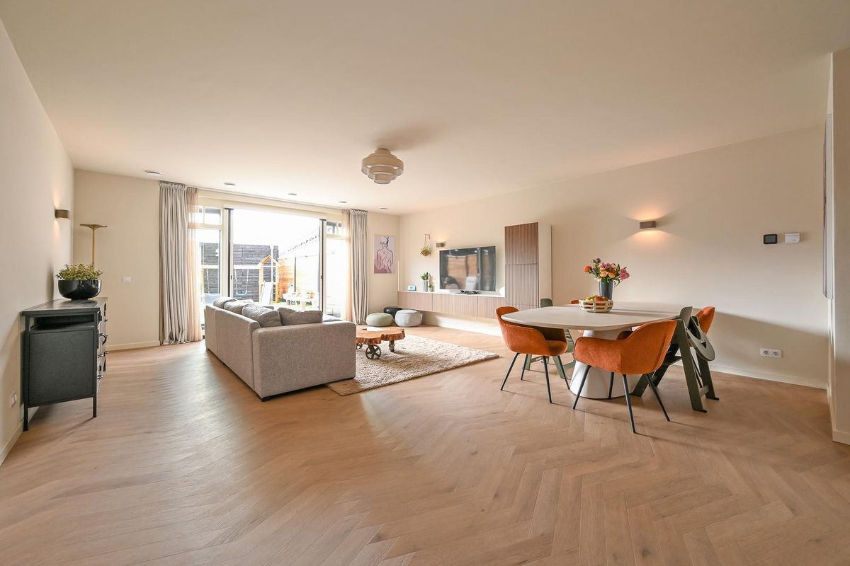 De lichte en ruime living met prachtige vloer in Weense punt en openslaande deuren naar de zonnige achtertuin op het zuidwesten zorgt voor een heerlijke leefruimte.
