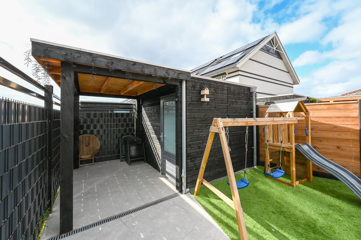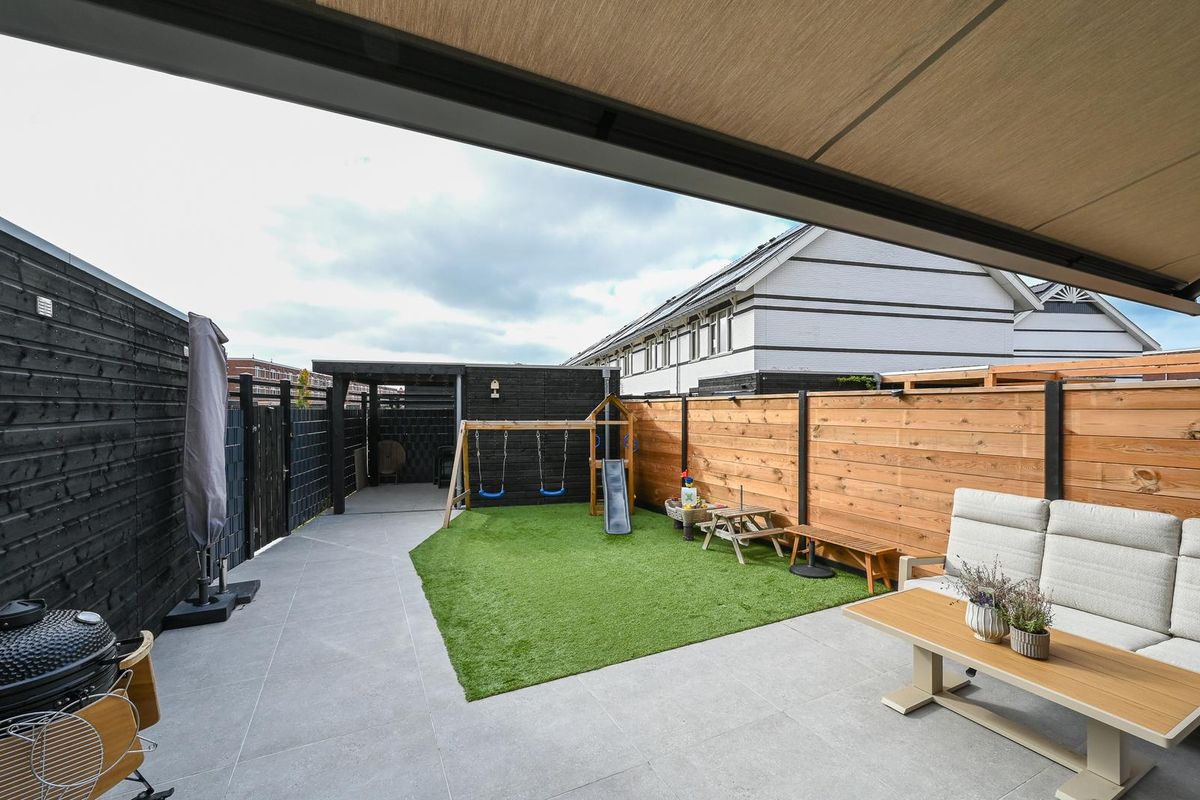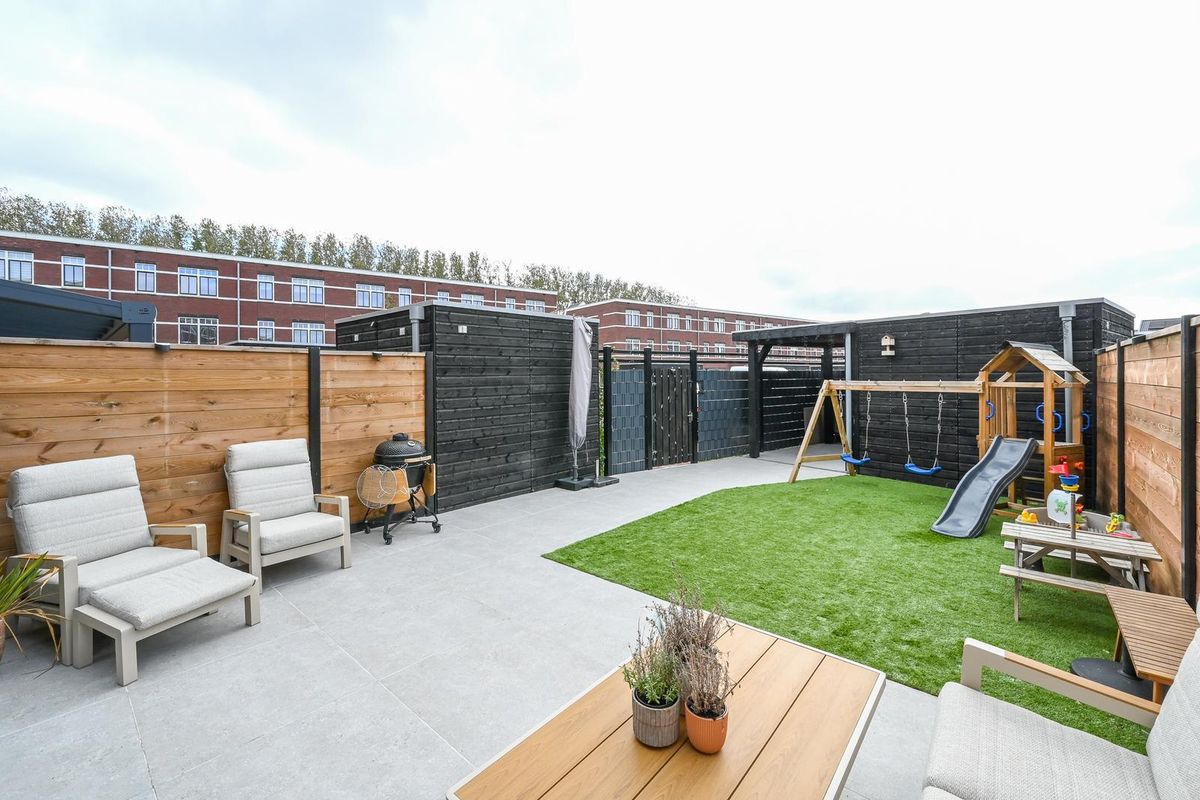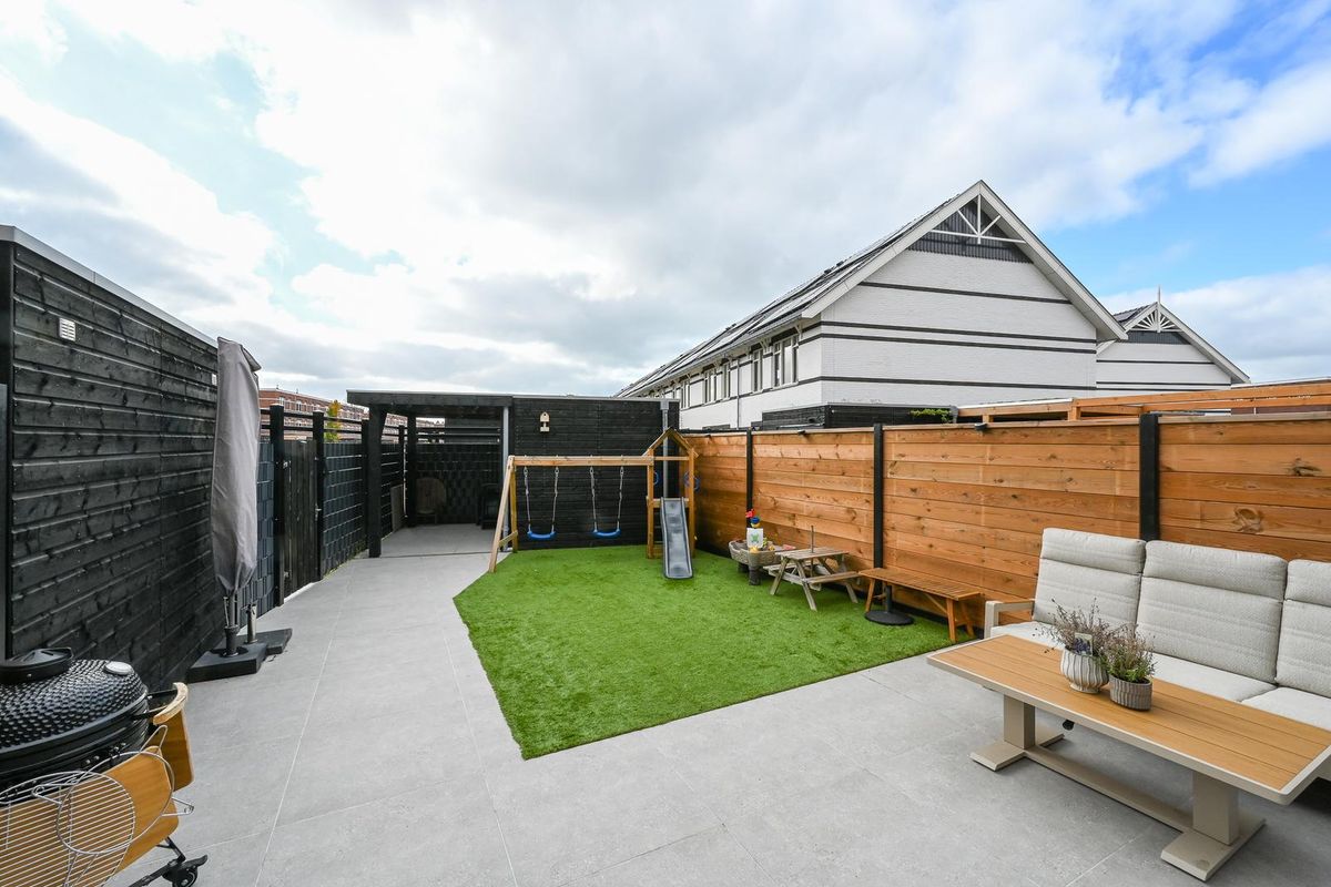 De ruime living is vergroot dankzij de aanbouw en de brede beukmaat van ca. 5,70 meter. De fraaie vloer in Weense punt en gestuct plafond geven de ruimte een warme en elegante uitstraling. Via de openslaande deuren bereikt u de zonnige achtertuin op het zuidwesten, met een sfeervol terras en een groenstrook waar u in alle rust kunt genieten. De overkapping biedt beschutting tijdens lange zomeravonden, terwijl de houten berging en achterom zorgen voor praktisch gemak en extra opbergruimte. De eigen parkeerplaats op het achtergelegen terrein maakt het woongenot compleet.