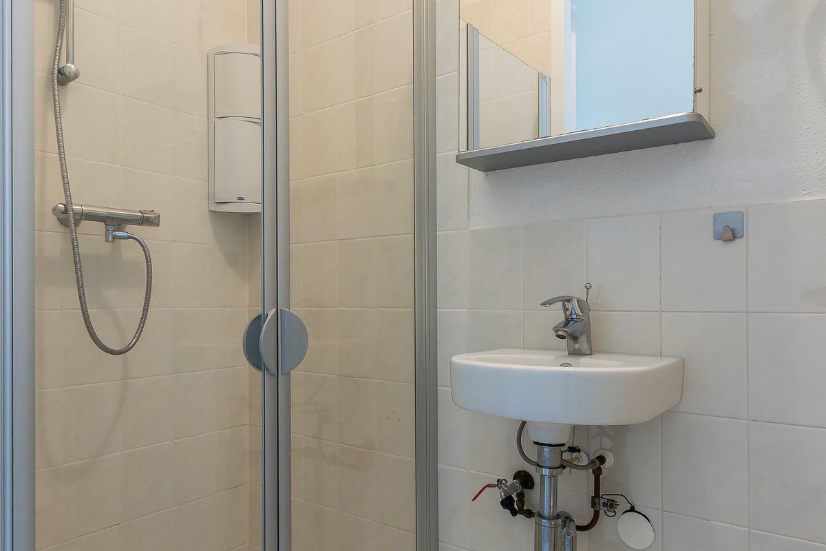 De half betegelde badkamer (badkamer 2) is voorzien van een douche, wastafel en een toilet.