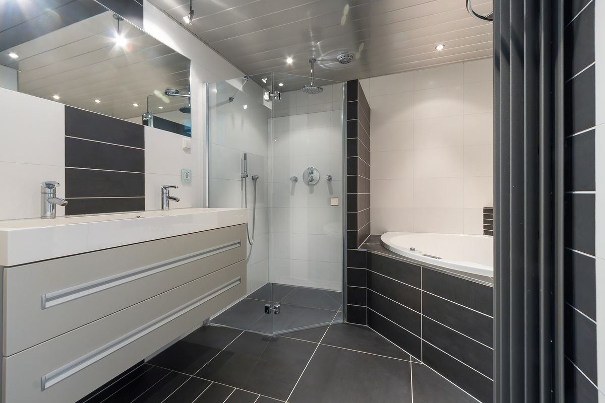De moderne badkamer is vergroot waardoor de jacuzzi meer dan voldoende ruimte heeft. Er is een inloopdouche (“rainshower”) en een breed wastafelmeubel met 2 kranen. Het verlaagde plafond is voorzien van inbouwspots.