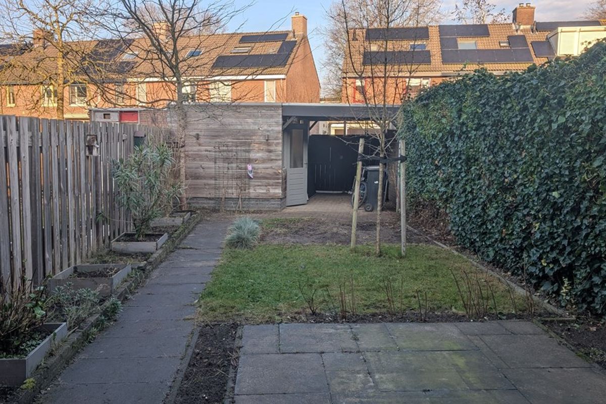 Buiten: achtertuin (ca. 90 m², inclusief berging) op noordoosten met terras, grasveld, overkapping (15 m²), berging (15 m²) en achterom naar parkeerterrein.