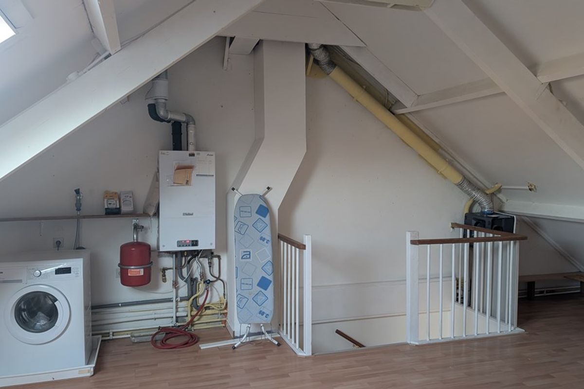 Tweede verdieping: ruime zolder met dakraam, bergruimte, HR-ketel, omvormer zonnepanelen, ventilatie-unit en wasmachine-aansluiting.