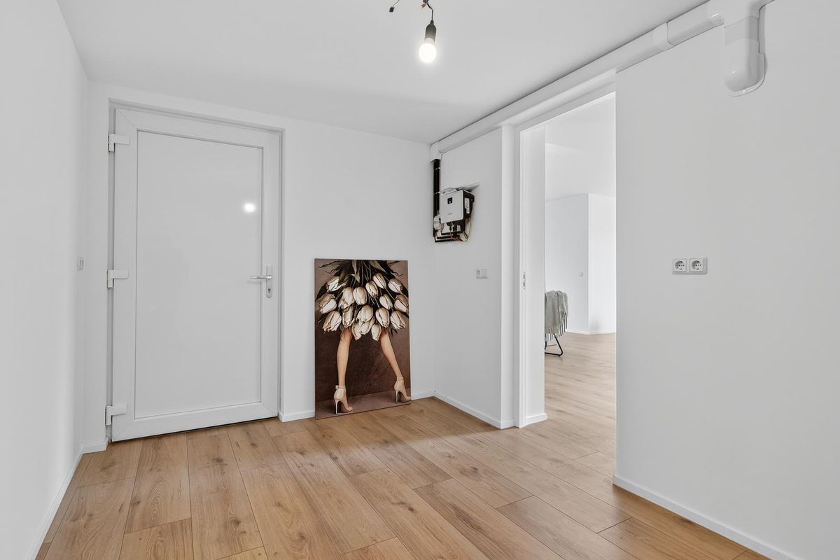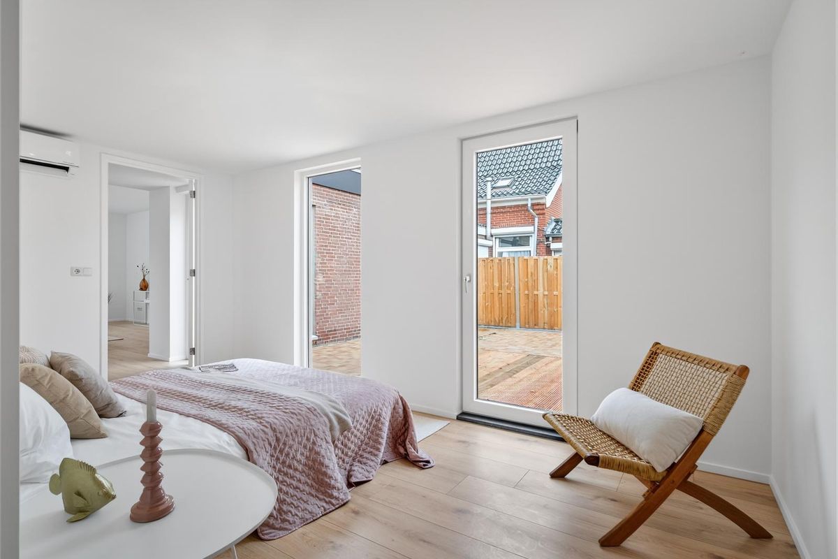 Bij binnenkomst in de hal vind je toegang tot de woonkamer met open keuken, de meterkast, het toilet en de eerste slaapkamer aan de voorzijde van de woning. De lichte woonkamer heeft een prettige indeling en staat in open verbinding met de moderne keuken, die is uitgerust met een combi-oven, koelkast, 4-pits inductiekookplaat, vaatwasser, afzuigkap en wasbak. Vanuit de woonkamer bereik je de patiotuin, de wasruimte en de tweede slaapkamer aan de achterzijde van de woning.