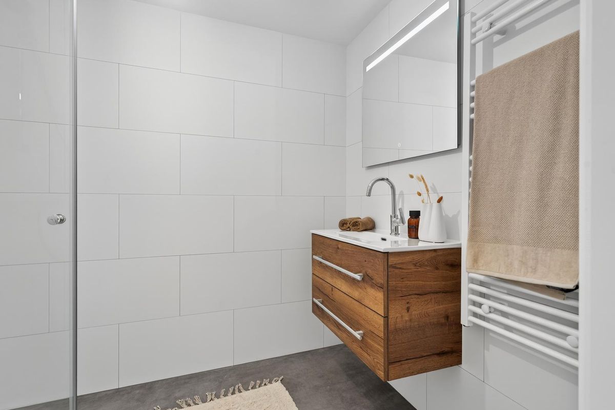 De badkamer, bereikbaar via de slaapkamer aan de achterzijde, is volledig betegeld en voorzien van een wastafel met meubel, designradiator en douche. Het aparte toilet is eveneens volledig betegeld en beschikt over een fonteintje.