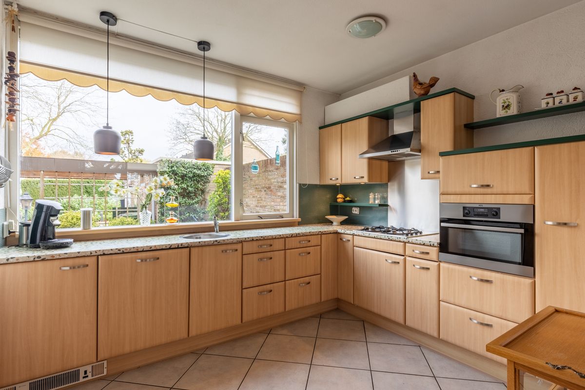 De open keuken bevindt zich aan de voorzijde van de woning en is uitgerust met diverse inbouwapparatuur, waaronder een kookplaat, afzuigkap, combimagnetron, koelkast en vaatwasser. De opstelling is praktisch en biedt volop werk- en kastruimte – ideaal voor wie graag kookt.