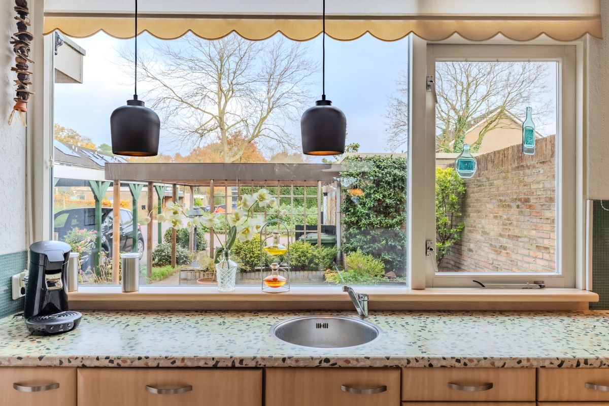 Via de openslaande tuindeuren bereikt u de verzorgde achtertuin, waar u optimaal kunt genieten van het vrije uitzicht en de rust die deze plek te bieden heeft.