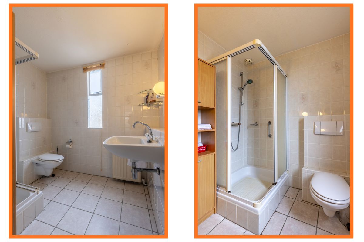 • Badkamer met douchecabine, wandtoilet en wastafel