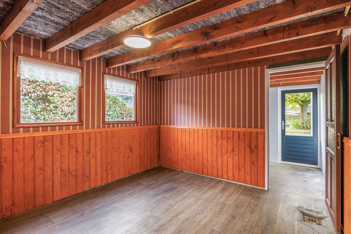 De garage is aangebouwd. De garage is nu opgedeeld in een chill-ruimte en een berging. De garagedeur is nieuw.