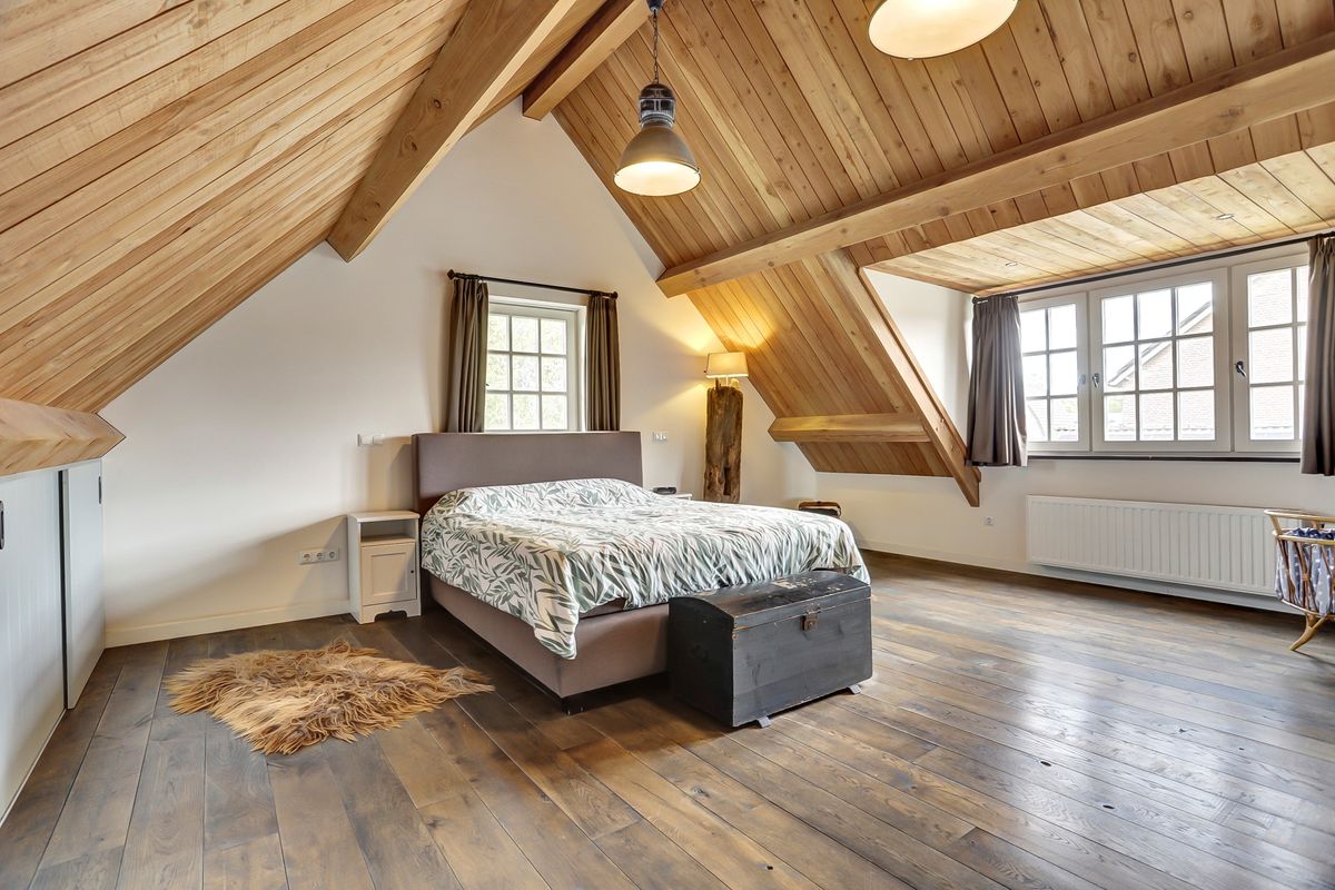 Boven vind je vier verrassend ruime slaapkamers en een tweede badkamer wat ideaal is voor een gezin dat wat extra ruimte kan gebruiken of om logees in de watten te leggen. De combinatie van de strakke eikenhouten vloer, gestucte wanden en de karakteristieke houten balken geeft de verdieping die typische warme, landelijke sfeer waar je meteen blij van wordt.