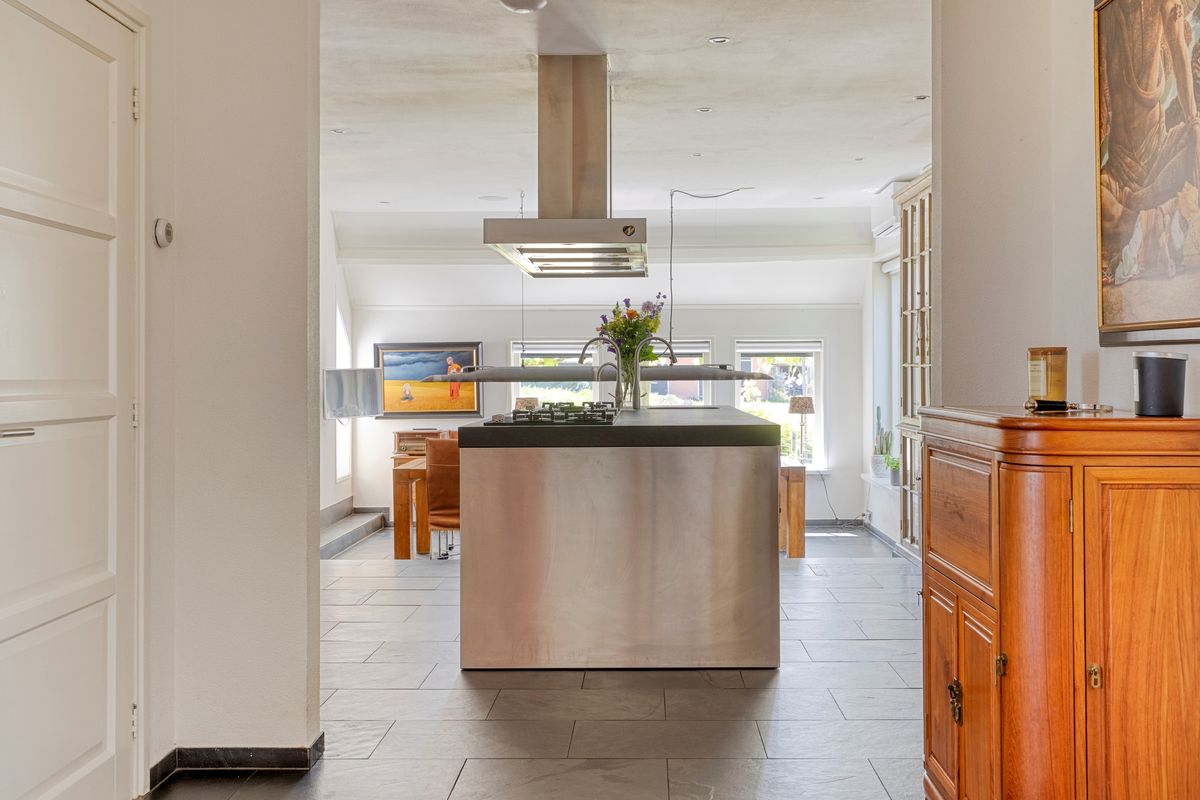 Entree met ruime hal, toilet, werk-/sportkamer, ruime woonkamer met veel daglicht en open haard, open keuken met werkeiland en toegang naar de tuinkamer. De woonkamer en keuken zijn voorzien van vloerverwarming. De keuken is van alle gemakken voorzien en volledig uitgerust met inbouwapparatuur. De ruime hal wordt momenteel gebruikt als extra kamer ten behoeve van boekenkasten en biljarttafel, met toegang naar een terras aan de achterzijde. Via een tussenhal is de slaapkamer met eigen badkamer bereikbaar, evenals de bijkeuken met wasmachine-aansluiting en cv-ketel.