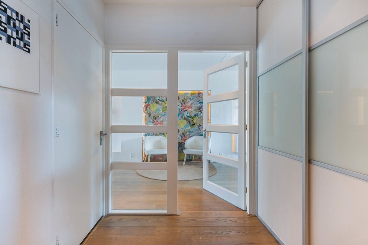 Via de entree komt u in de hal met toiletruimte, kastruimte en de trapopgang. Vanuit hier stapt u de lichte woonkamer in: ruim opgezet, met volop mogelijkheden voor een royale zithoek zonder dat dit ten koste gaat van de loopruimte. De indeling voelt open en verbonden, maar biedt tegelijk genoeg plekken om het knus en gezellig in te richten. De gehele begane grond beschikt over een houten vloer. De verlichting is geïntegreerd in de wanden, wat een mooi ruimtelijk effect geeft.