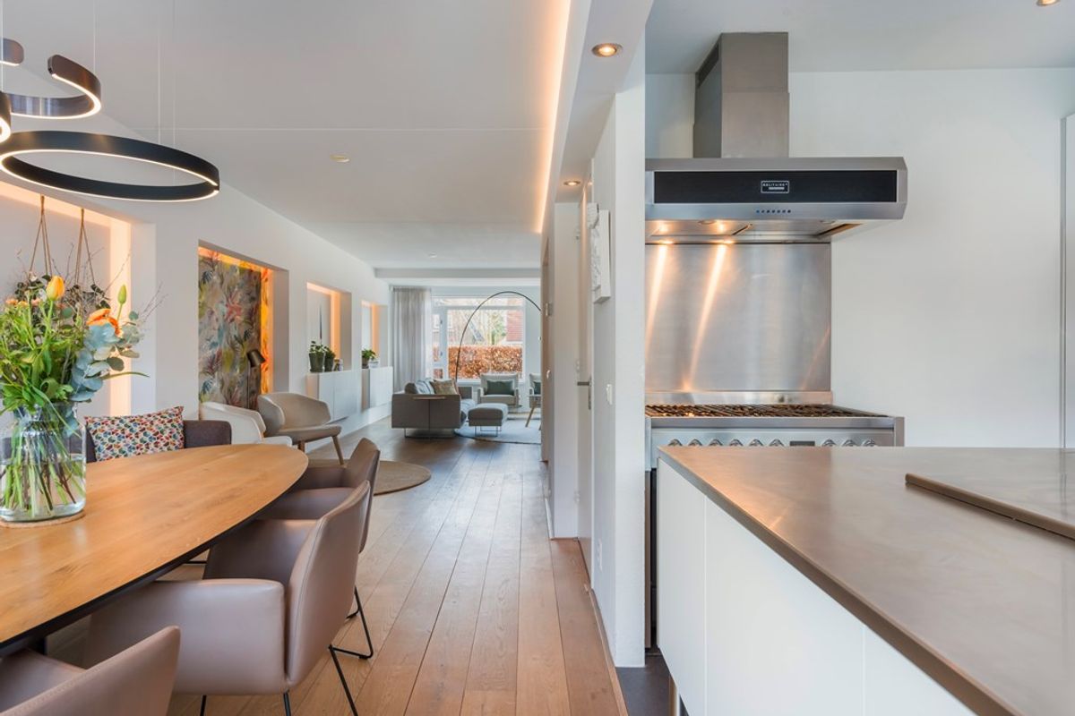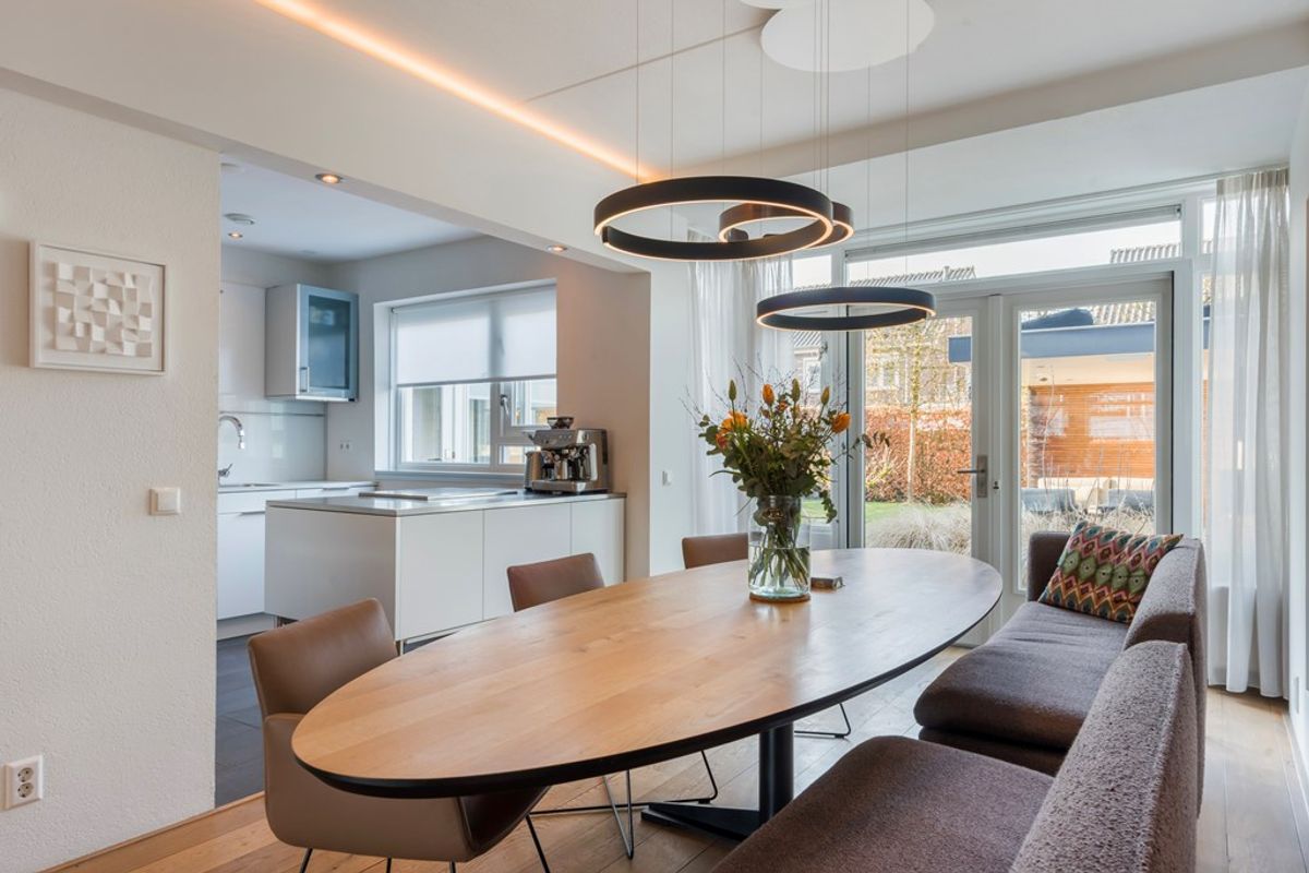 De half -open en moderne keuken van Bulthaup vormt samen met de eethoek het hart van de woning: een heerlijke plek om te koken en gezellig samen te zijn. Aansluitend aan de eethoek bevinden zich openslaande deuren naar buiten, waardoor binnen en buiten op natuurlijke wijze in elkaar overlopen. Vanuit de hal bereikt u ook de garage (met bergzolder) welke ideaal te gebruiken is als bergruimte en/of stalling van de auto en fietsen. Achter de garage bevindt zich nog een extra kamer; ideaal als thuiswerkplek, hobbyruimte of speel-/logeerkamer. Deze ruimte kan ook gebruikt worden als slaapkamer, tevens kan er ook een badkamer gerealiseerd worden in de garage.