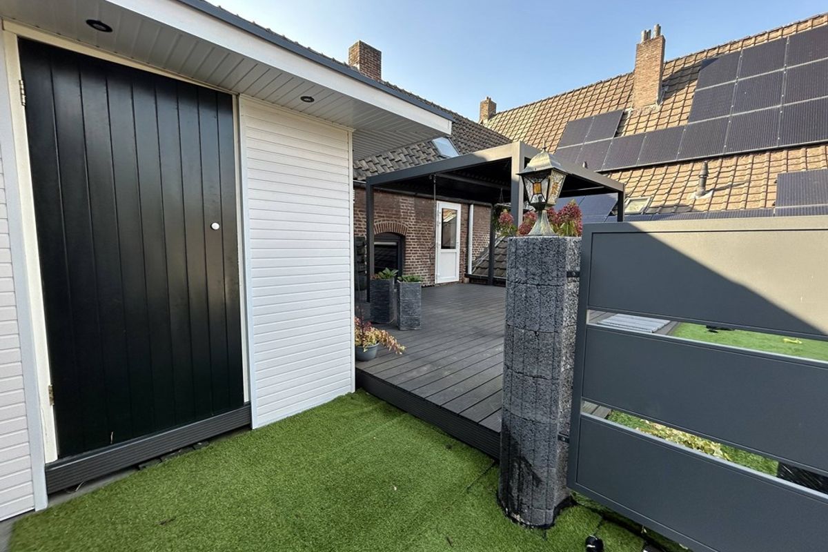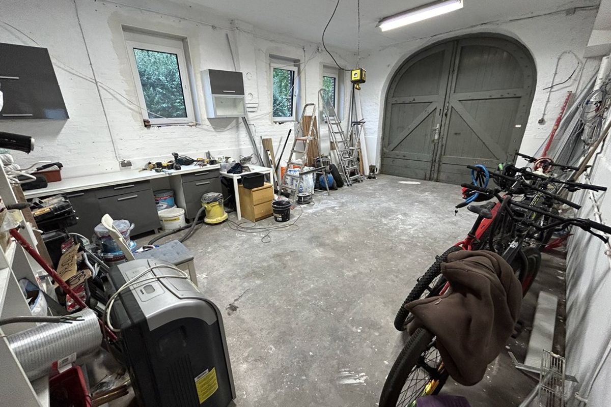 Inpandig bereikbare garage 6,95 x 4,75 met openslaande deuren, omvormer voor 24 zonnepanelen (eigendom) en nieuwe meterkast met slimme stroommeter.
