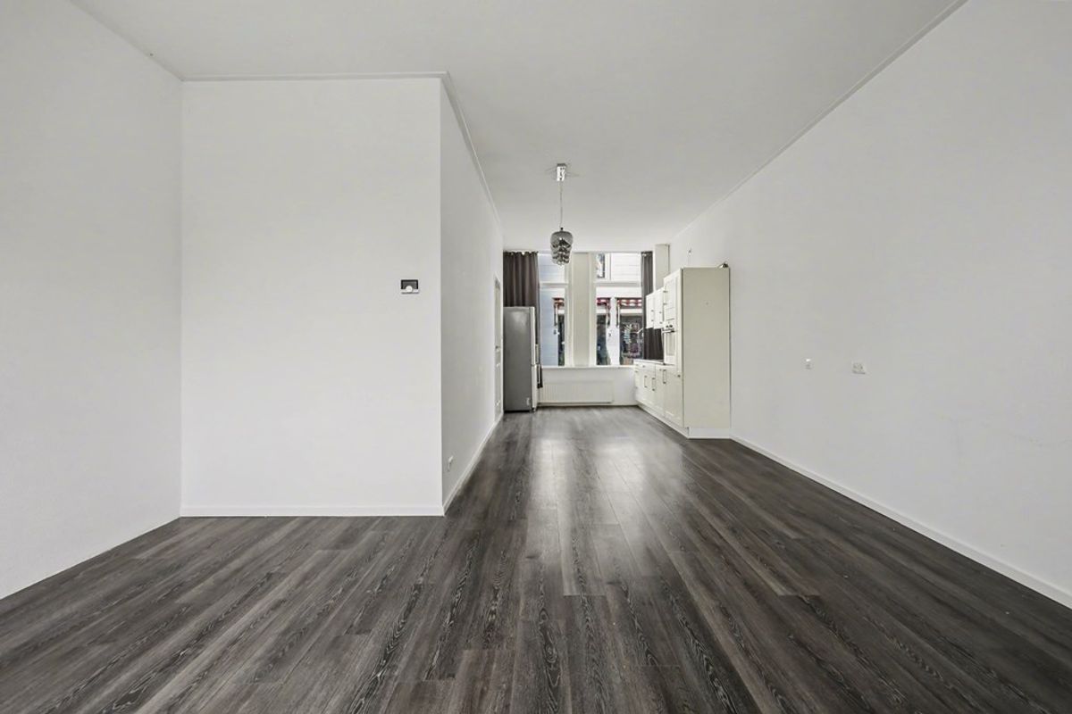 De indeling is als volgt is: entree, hal met meterkast, trap naar het souterrain en de verdieping en toegang tot de L-vormige living van 38 m², bestaande uit de aan de straatzijde gelegen eetkeuken (met nette inbouwkeuken v.v. -apparatuur) en de aan de achterzijde gelegen woonkamer met hoge plafonds. De vloer is afgewerkt met laminaat.