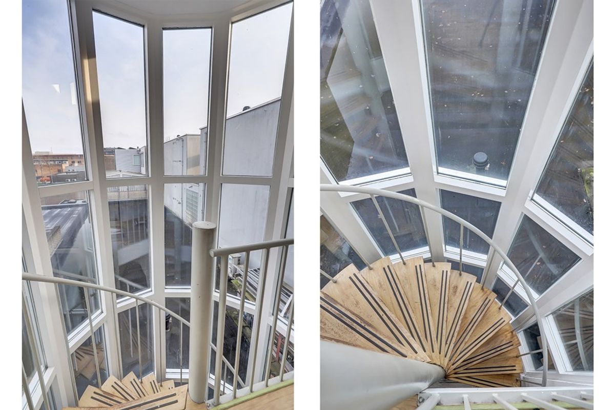 De trapopgang is voorzien van een grote raampartij die ervoor zorgt dat veel licht in de maisonnette gebracht wordt.