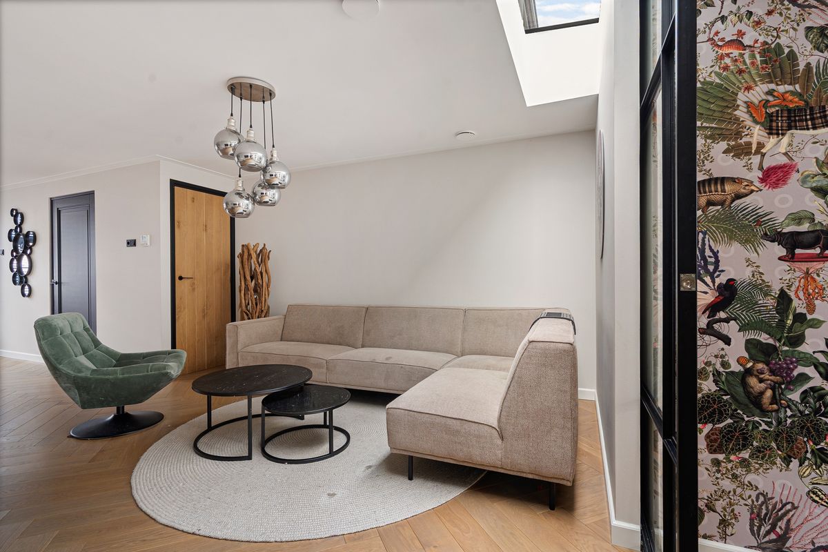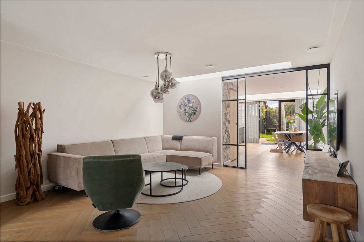 De woonkamer en luxe eetkeuken zijn van elkaar gescheiden middels een moderne schuifpui – perfect om rust en ruimte te creëren. De eetkeuken is ondergebracht in de uitbouw met een groot daklicht, wat zorgt voor fantastisch daglicht. De keuken zelf is modern uitgevoerd en voorzien van hoogwaardige inbouwapparatuur. Aangrenzend bevindt zich de bijkeuken, met volop bergruimte en plek voor voorraad of apparatuur.